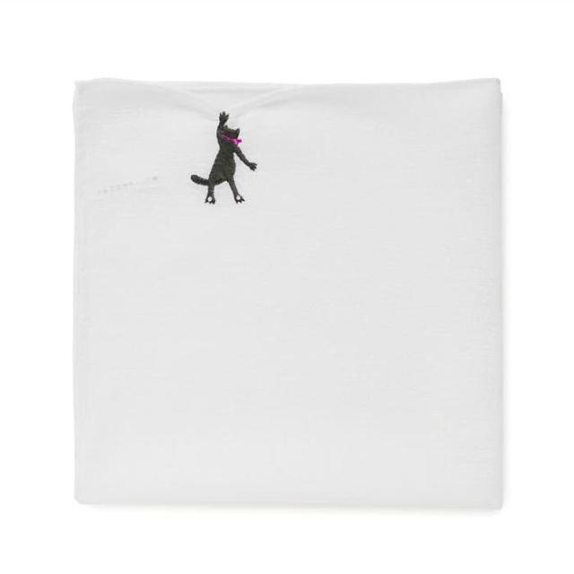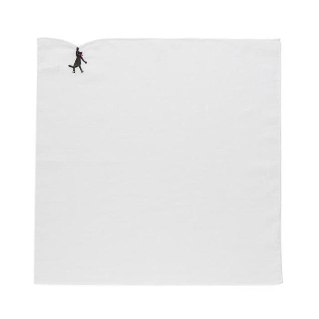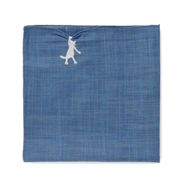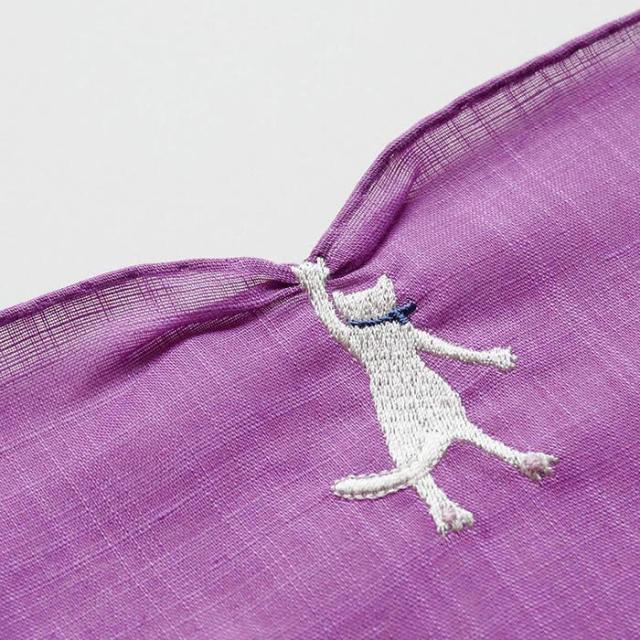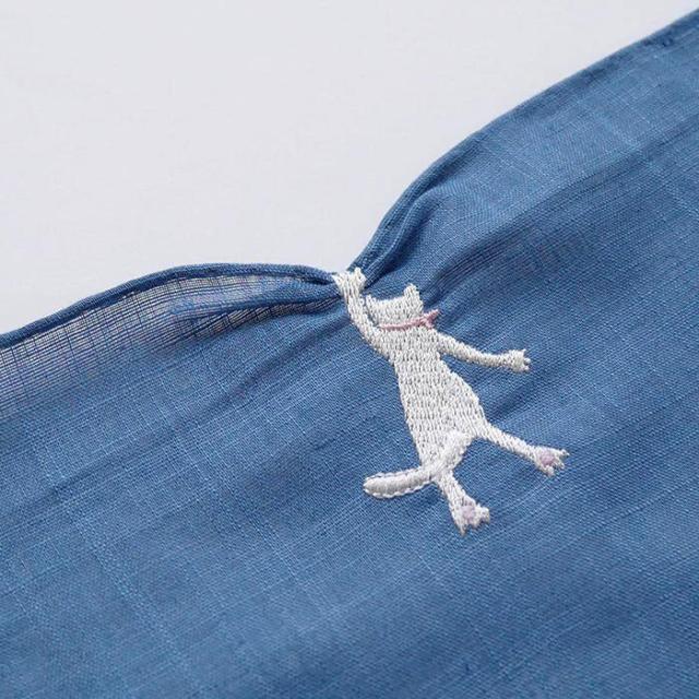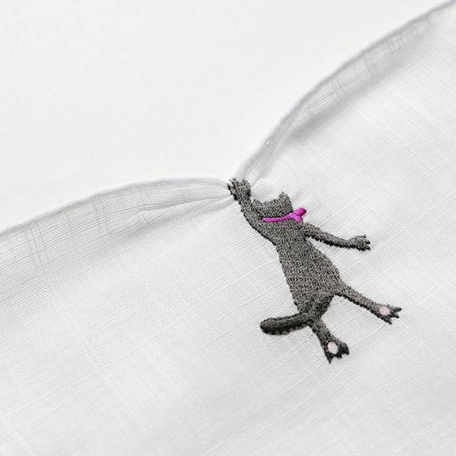 ハンカチーフの縁に猫が片手でぶら下がっているシーンを刺繍で表現。