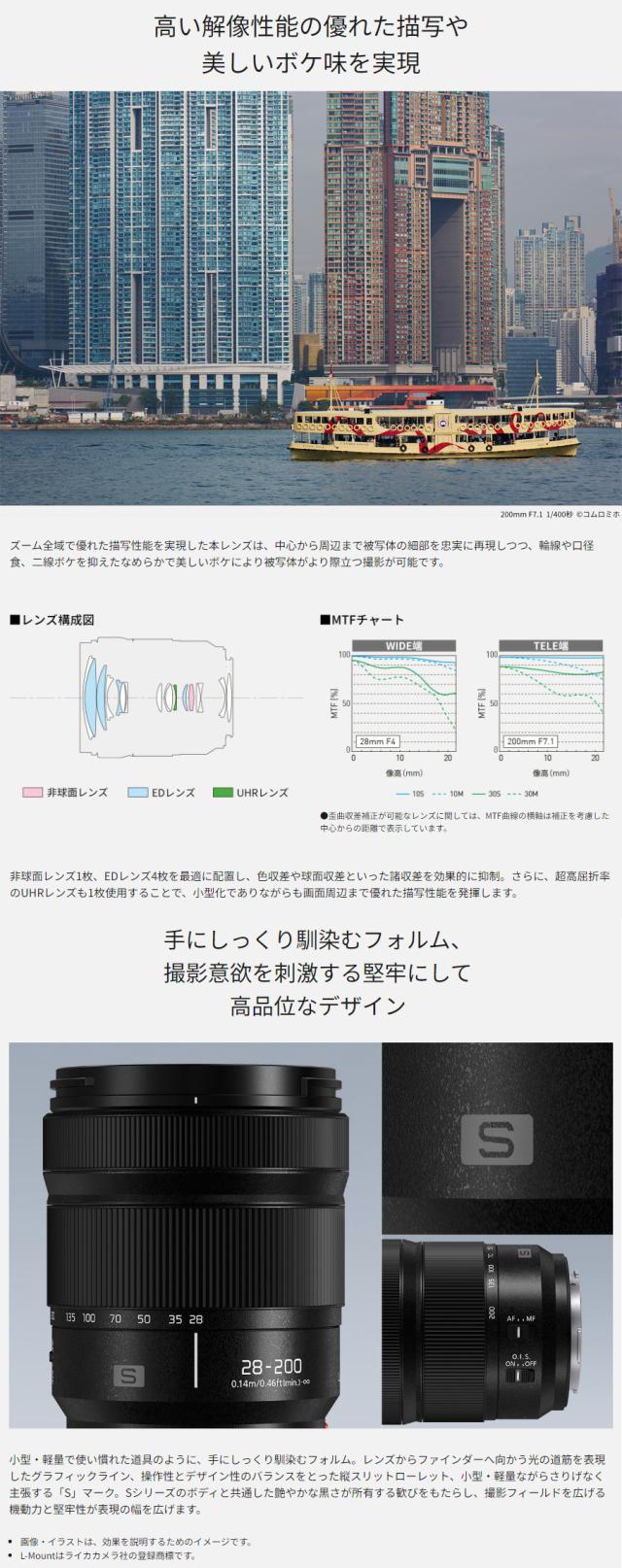 | レンズ構成 | LUMIX S 28-200mm F4-7.1 MACRO O.I.S.(S-R28200) 13群17枚(非球面レンズ1枚、EDレンズ4枚、UHRレンズ1枚) |