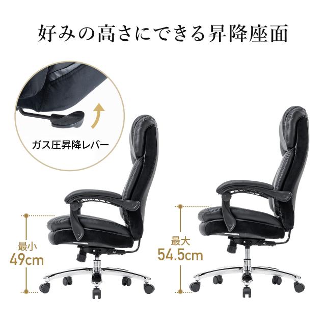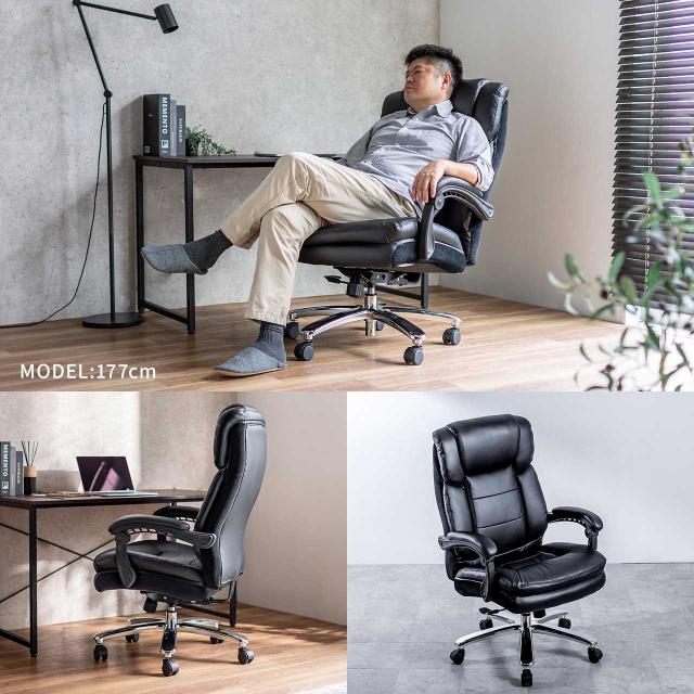⇒ご購入の前にご確認下さい強靭なガスシリンダーを採用し、耐荷重200kgの高耐荷重チェア。長時間座っても疲れにくい厚みのクッションとゆったり座れる幅広設計のレザーチェア。足が浮きにくいシンクロロッキング仕様。シルバーのスチールフレームを採用した高級感溢れるレッグフレーム。【WEB限定商品】