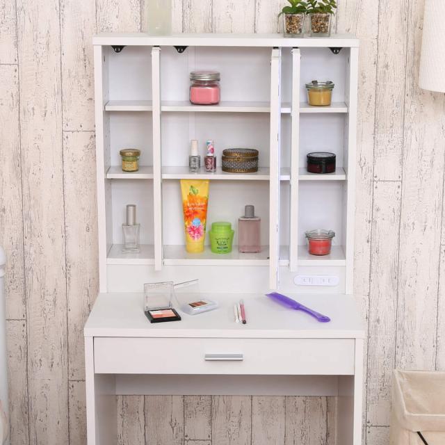 ミラー裏には高さ調節できる棚板収納スペースがあります。幅広い引き出し収納もついているので、多くのメイク用品やアクセサリーを整理しておくことができます。