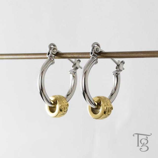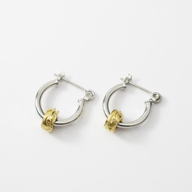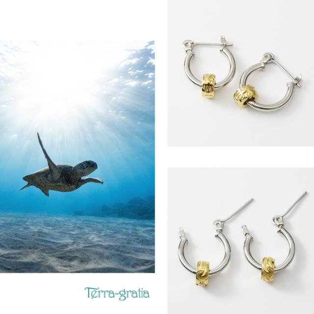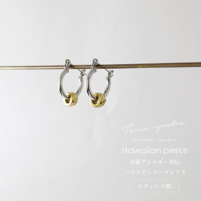 ハワイアンジュエリー ピアス フープピアス リングチャーム ホヌ 金属アレルギー対応 ステンレス レディース キャッチレス 両耳 シルバー×イエローゴールドカラー gess517styg