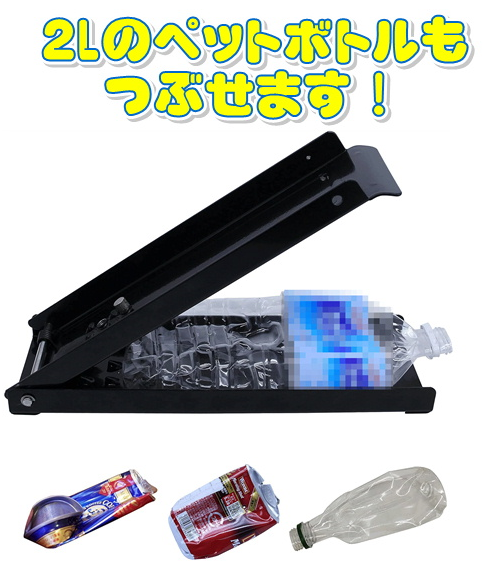 大きいサイズから普通の缶(300ml,500ml)、ペットボトルもちろん。2リットルペットボトルも潰れる。