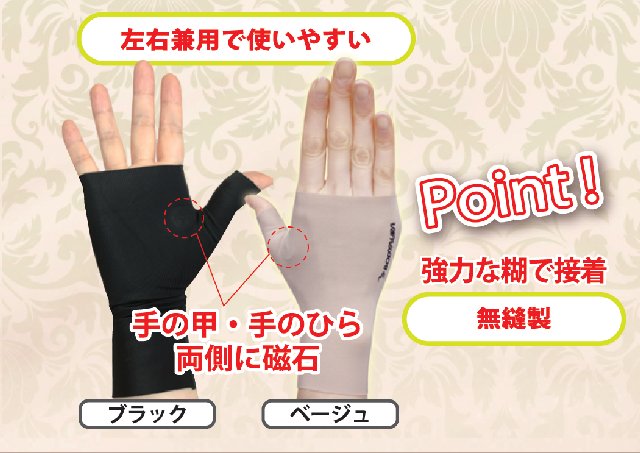 | 磁気パワーで疲労などにより硬くなった手のコリをほぐし、血行を良くする。 | |