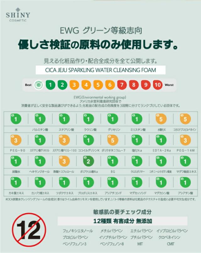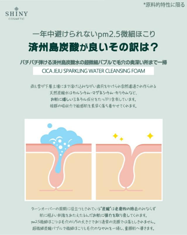 | 済州炭酸水と虎草と呼ばれるツボ草の良い成分のみ油出して、どんな汚れも完全にクレンジングする事が出来ます。 SHINY CICAスパークリングウォータークレンジングフォームは、トラ草と呼ばれる済州スパークリングウォーターとセンテラの優れた成分のみでつくられ、あらゆる肌タイプの方の顔や体を安全にクレンジングします。 「炭酸」は皮膚のハリをたもち、皮膚のうるおい、弾力を取り戻します。 |