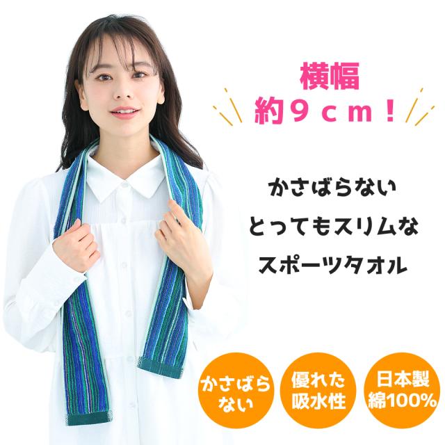縦幅なんと9cm!とってもスマートなスポーツタオルができました。首に巻いて使えるスリムサイズ。長さもスポーツタオルとして最適な100cm以上の超ロング!軽くて薄手なので、首に掛けても軽い使い心地!折りたたんでバッグやポーチに入れてもかさばらずコンパクトだから持ち運びラクラクです。