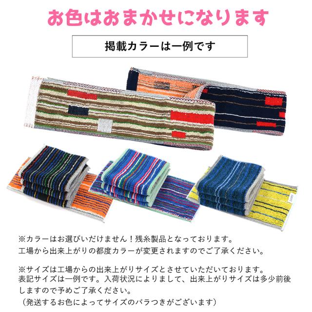 こちらのタオルは、今治タオル工場の残り糸(残糸)で作成した特別製品です。サイズは、入荷の都度変更になりますのでご了承ください。