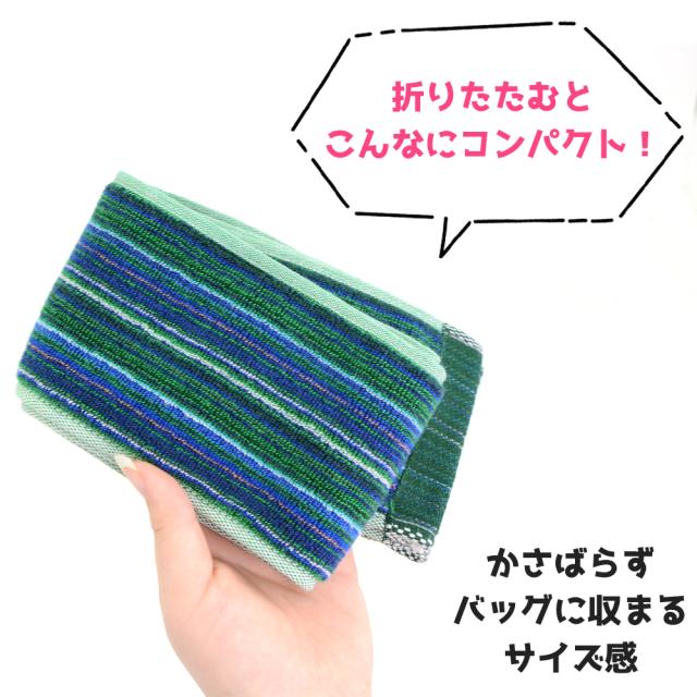今治タオル工場の残り糸を使い、吸水性抜群のパイル生地で仕上げられています。パイルが立ち上がったふんわりと弾力を感じる風合いで、軽やかな使い心地です。薄くてコンパクトなのに、しっかり吸水!ベタつかず、濡れたりお洗濯した後もすぐ乾きます。
