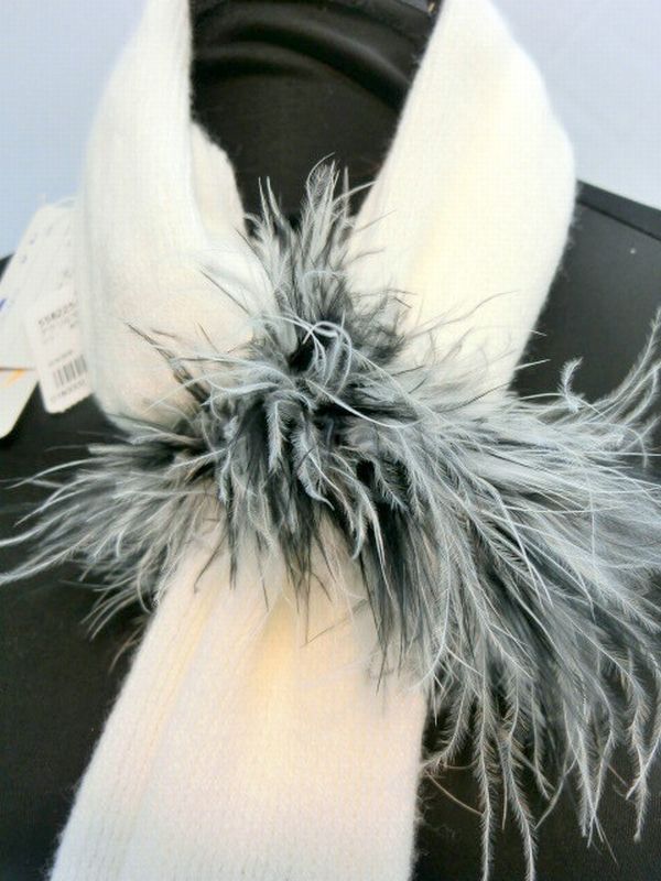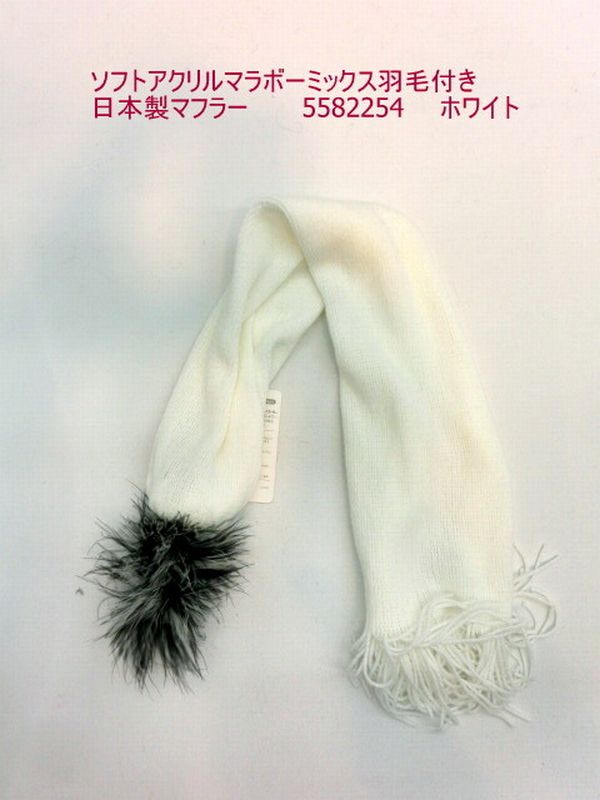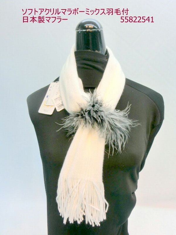 | 柔らかい無地のソフトアクリルマフラーにマラボーミックス羽毛を付けました。オシャレな日本製マフラーです。 |