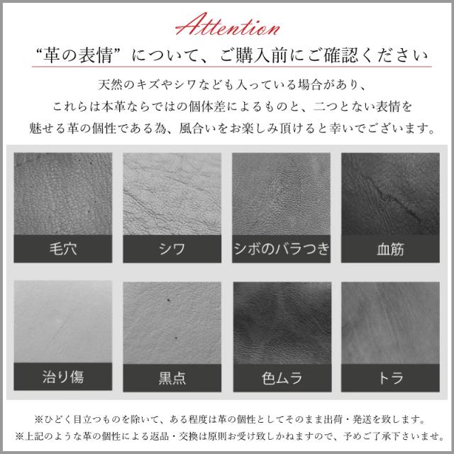| 注意事項 | 当店で使用している本革は全て本物の革を使用しています。 その為、皮革の模様など掲載画面と異なる場合がございます。 ※ご覧頂いている商品の写真につきましては、できるだけ実物の色に近くなるように努めておりますが、 お使いの環境(モニター、ブラウザ等)の違いにより、色の見え方が実物と若干異なる場合がございます。※ ※掲載商品と色味、模様・柄が異なる理由などのイメージ違いで返品・交換の場合は、返送料お客様ご負担での返送をお願いしております。 予めご了承くださいませ。※ |