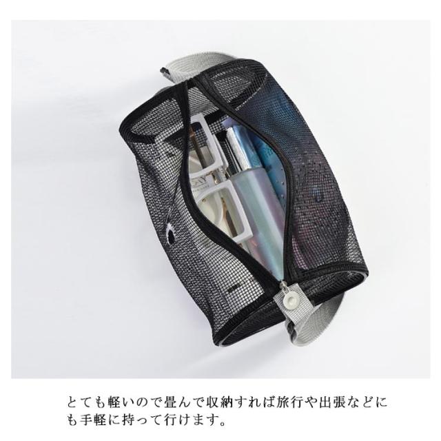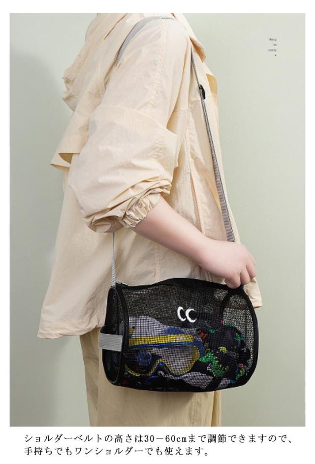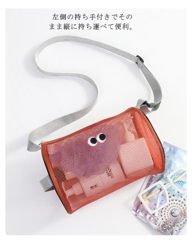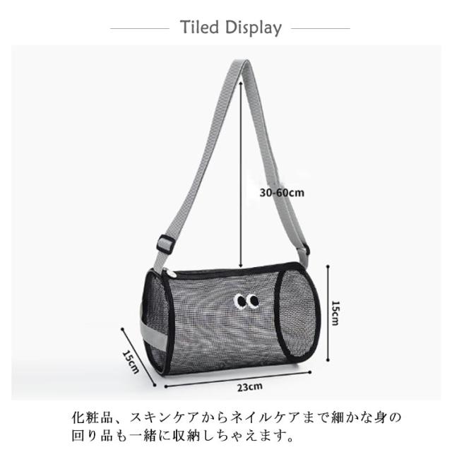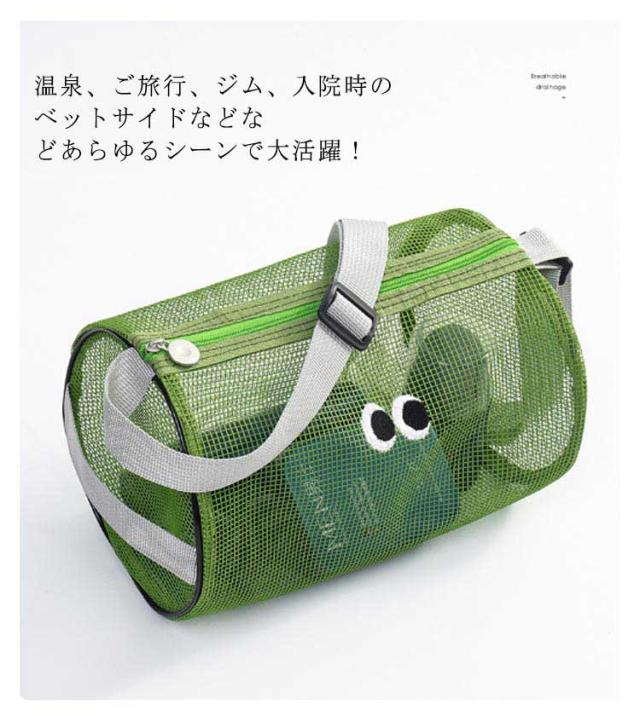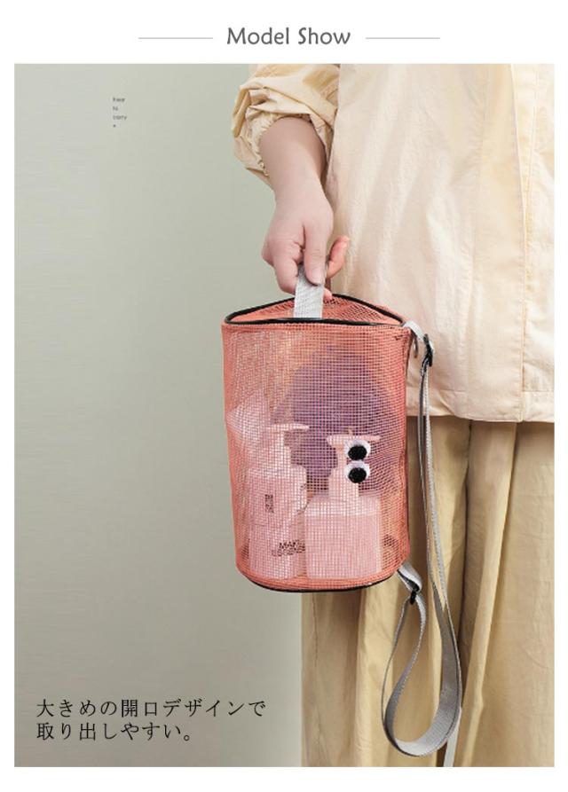 | 大きめ目刺繍のメッシュバケツバッグ。 大きめの開口デザインで取り出しやすい。 ショルダーベルトの高さは30−60cmまで調節できますので、手持ちでもワンショルダーでも使えます。 左側の持ち手付きでそのまま縦に持ち運べて便利。 化粧品、スキンケアからネイルケアまで細かな身の回り品も一緒に収納しちゃえます。 とても軽いので畳んで収納すれば旅行や出張などにも手軽に持って行けます。 温泉、ご旅行、ジム、入院時のベットサイドなどなどあらゆるシーンで大活躍! | |