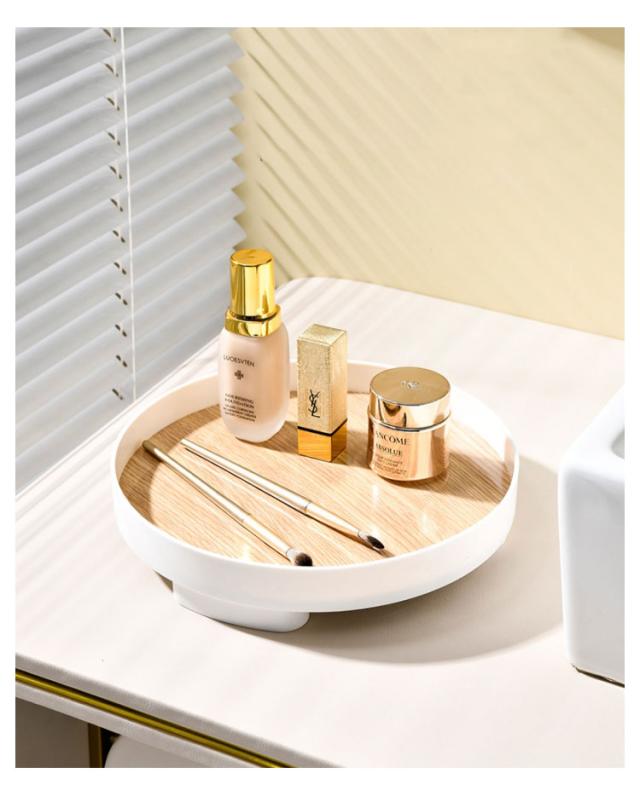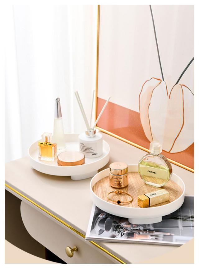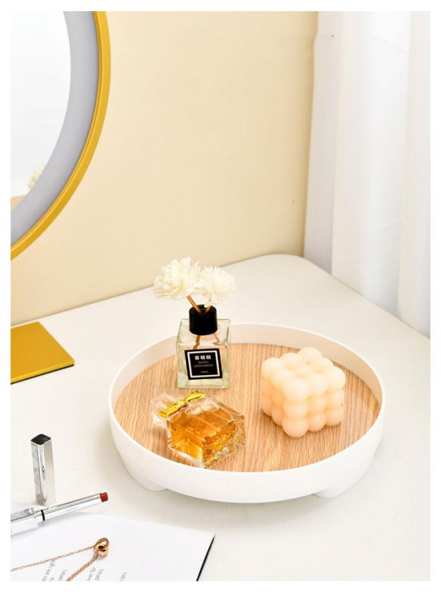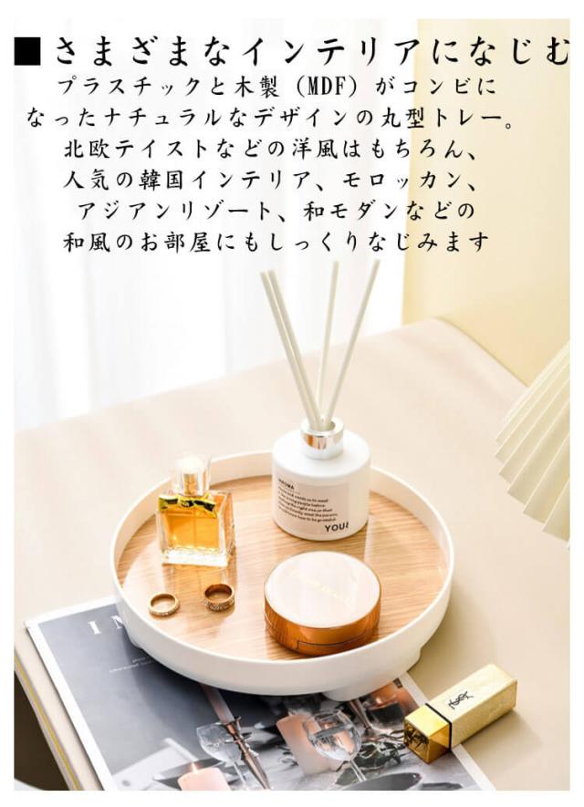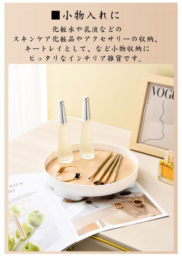 | ■お盆として来客時に コーヒーカップやポット、お菓子を運ぶのにぴったりな脚付きのおぼんは、来客用としても自分のお食事用としても役立ちます。 そのままダイニングテーブルに置いておけるおしゃれなデザインです。 ■小物入れに 化粧水や乳液などのスキンケア化粧品やアクセサリーの収納、キートレイとして、など小物収納にピッタリなインテリア雑貨です。 ■さまざまなインテリアになじむ プラスチックと木製(MDF)がコンビになったナチュラルなデザインの丸型トレー。 北欧テイストなどの洋風はもちろん、人気の韓国インテリア、モロッカン、アジアンリゾート、和モダンなどの和風のお部屋にもしっくりなじみます。 | |