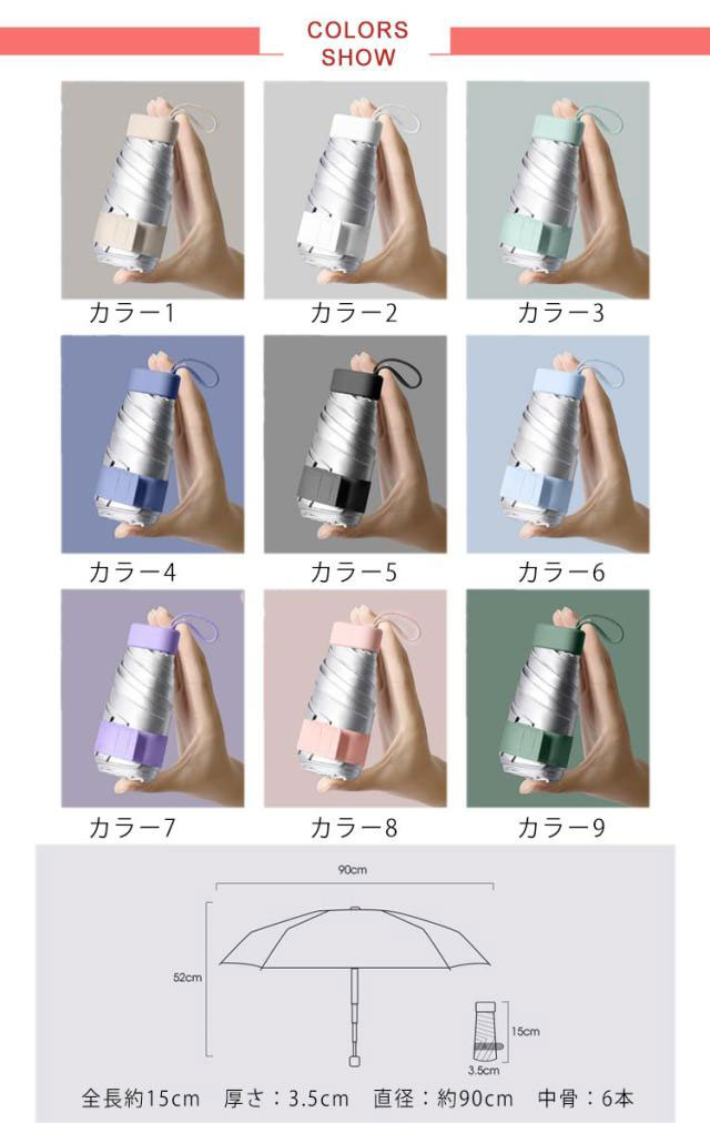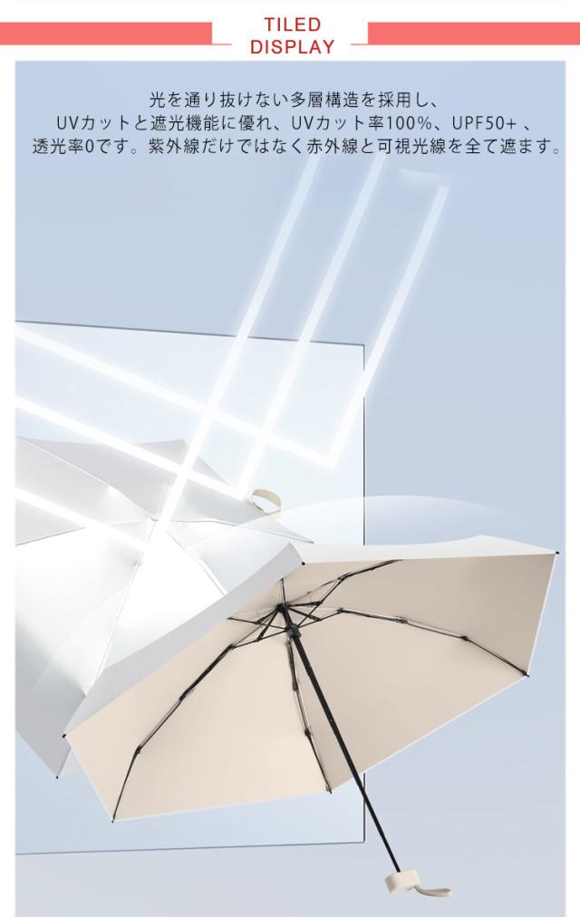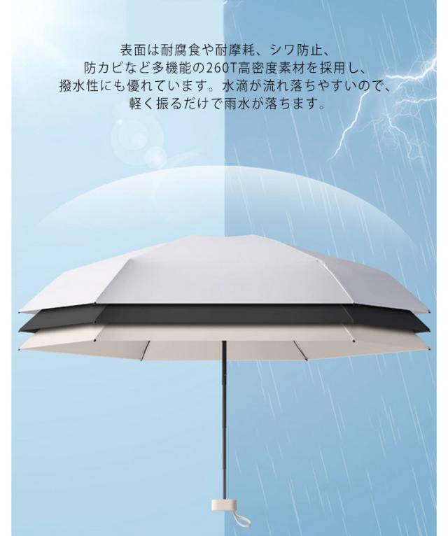 | 収納後の大きさは15cm、手のひらサイズです。軽くてコンパクトで持ち運び便利、カバンに入れて常備しても負担になりません。本体の重さは軽量化を実現しました! 光を通り抜けない多層構造を採用し、UVカットと遮光機能に優れ、UVカット率100%、UPF50+ 、透光率0です。紫外線だけではなく赤外線と可視光線を全て遮ます。炎天下でも涼しく快適に過ごすことができて、熱中症予防に効果的です。 表面は耐腐食や耐摩耗、シワ防止、防カビなど多機能の260T高密度素材を採用し、撥水性にも優れています。水滴が流れ落ちやすいので、軽く振るだけで雨水が落ちます。 6本のガラス繊維&アルミニウム合金製傘骨とスステンレス製中棒を採用して、錆びにくく、一般的な傘よりはるかに頑丈です。 折りたたみ日傘フラットなデザインで、バッグに簡単に入れることができます。可愛くて女の子にぴったり!グラスファイバー製の傘骨を採用し、通常の傘より強靭な設計となっていて、腐食損傷を防止します、軽さと丈夫さを兼備しています。 | |