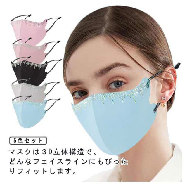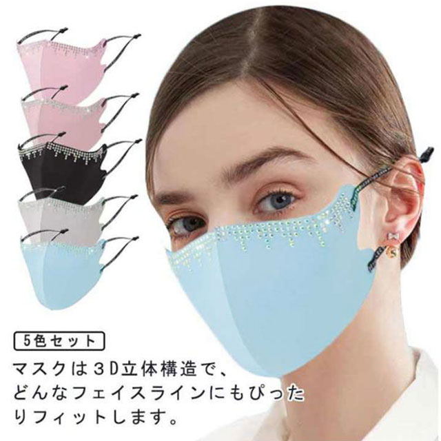 5枚セット キラキラマスク 立体マスク 接触冷感 ひんやりマスク キラキラマスク 風邪 冷感マスク ラインストーン 大人 カラーマスク 洗える UVカット 布マスク ビジュー 3D立体裁断 お肌に優しい 薄型 飛沫ガード 通気 防風 風邪 洗えるマスク