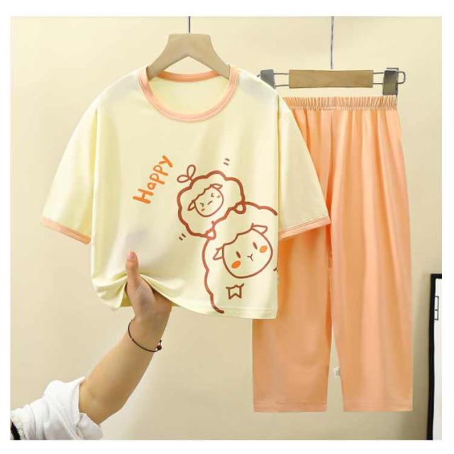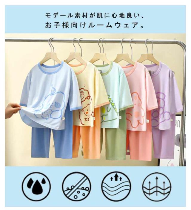 | モデール素材が肌に心地良い、お子様向けルームウェア。 足首が見える涼し気な七分丈パンツで夏場も快適。 パンツのウエストは総ゴムで楽ちん。ゆったりシルエットで着心地ラクチンです。 通気性が良いので熱を逃がし涼しく、夏に最適なパジャマです。 肌触り抜群、通気性と吸湿性に優れており、汗をかいてもすぐにサラっとしています。 ルームウェアや部屋着・パジャマとしてはもちろん、ちょっとしたお出かけにも! | |