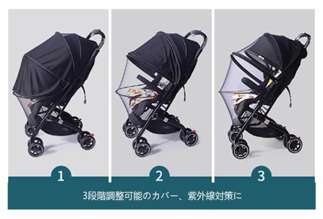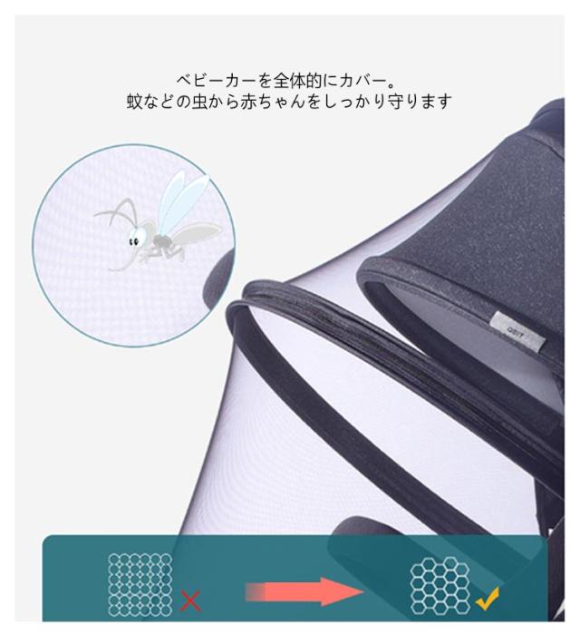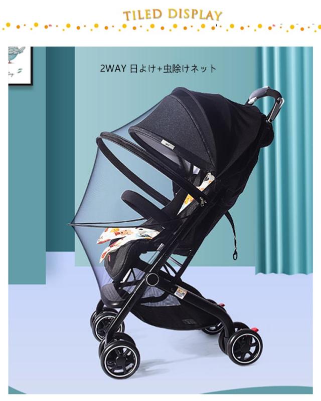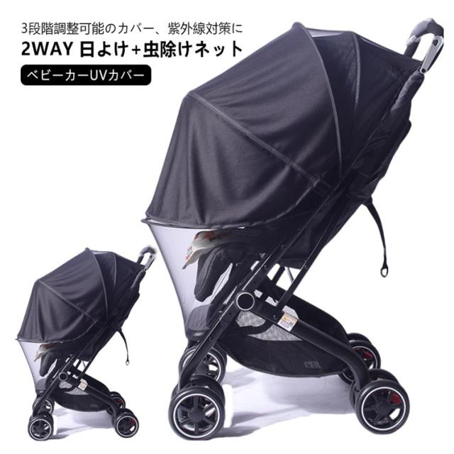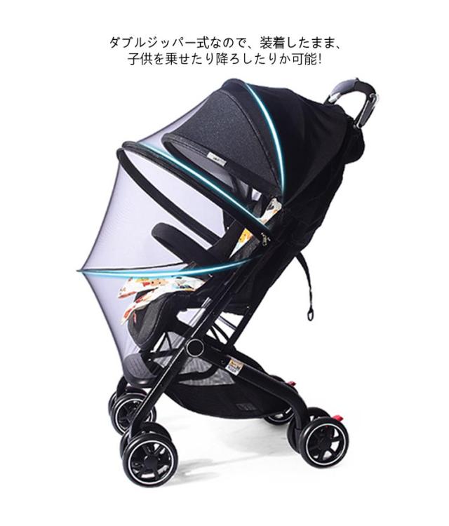 | 2WAY 日よけ+虫除けネット ダブルジッパー式なので、装着したまま、子供を乗せたり降ろしたりか可能! ベビーカーを全体的にカバー。蚊などの虫から赤ちゃんをしっかり守ります 3段階調整可能のカバー、紫外線対策に | |