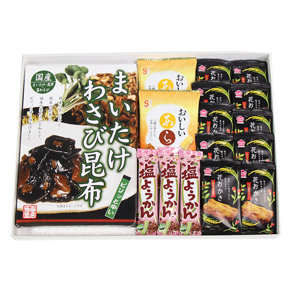 北海道産昆布と国産舞茸、国産茎わさびを使用した佃煮まいたけわさび昆布とあられやようかんのセットです。