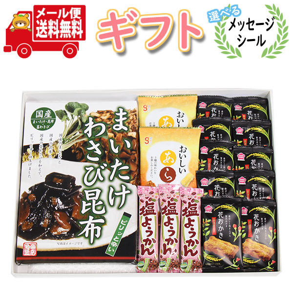 (全国送料無料)【選べるメッセージシール付き】まいたけわさび昆布<国産舞茸・昆布・茎わさび>とお菓子セット メール便 (omtmb9320g)【贈り物 お中元 お歳暮 お返し お礼 お祝い 手土産 お土産 母の日 父の日 ギフト】
