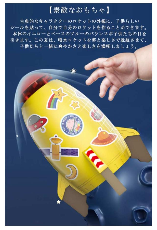 | 【夏定番のおもちゃ】夏ならではの噴水ロケットおもちゃを断っていい子どもはいません。暑い夏に外でホースをつなぐだけで、おもちゃのロケットを空中に打ち上げるのが楽しいです。水圧をコントロールしたり昇降したりするので、楽しさも増し、子どもの興味を刺激して楽しいアウトドアになります。 【取り付けが簡単で、手軽に楽しめます】 ホースの一部を台座に、もう一方の端を屋外の蛇口に接続します。おもちゃのロケットを台座に取り付けて蛇口をひねると、水の圧力に応じてロケットが上昇して回転し、噴水ができます。上昇の高さは水圧と風によって異なります。 【素敵なおもちゃ】古典的なキャラクターのロケットの外観に、子供らしいシールを貼って、自分で自分のロケットを作ることができます。本体のイエローとベースのブルーのバランスが子供たちの目を引きます。この夏は、噴水ロケットを夢と楽しさで就航させて、子供たちと一緒に爽やかさと楽しさを満喫しましょう。 【安全上質な素材】安全なABSプラスチック、厚手の処理で、おもちゃが壊れるのを防ぎます。頭部と周囲にevaフォームを採用し、子供を保護します。 【良いプレゼント】この噴水のおもちゃは男の子でも女の子でも遊ぶことができます。夏の野外活動に噴水のおもちゃが欠かせないでしょうか。子どもへのご褒美としても、祝日や誕生日のプレゼントにも、このロケットはぴったりです。 | |