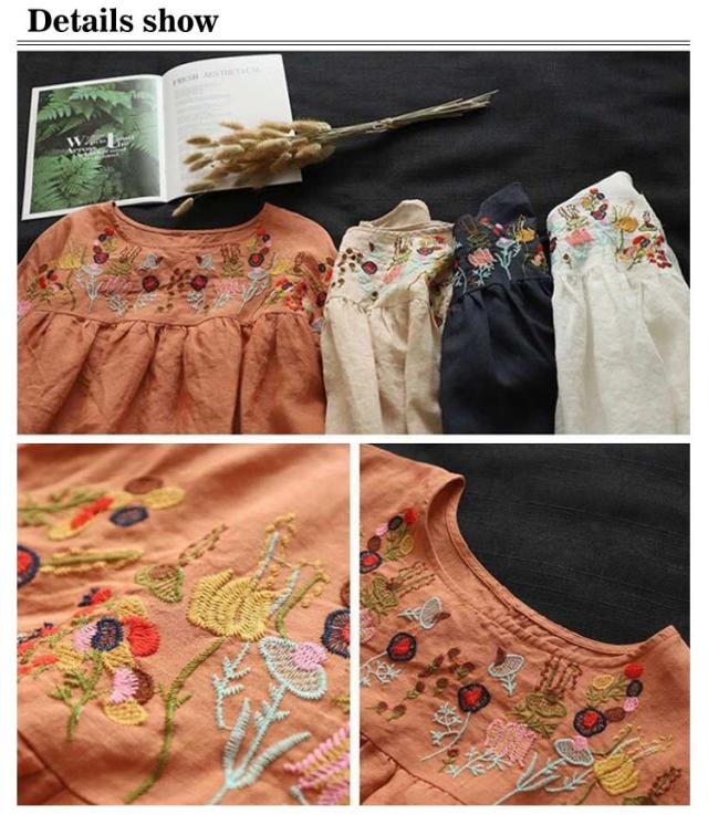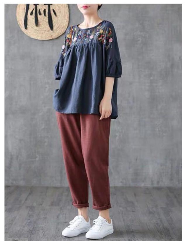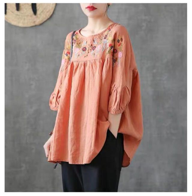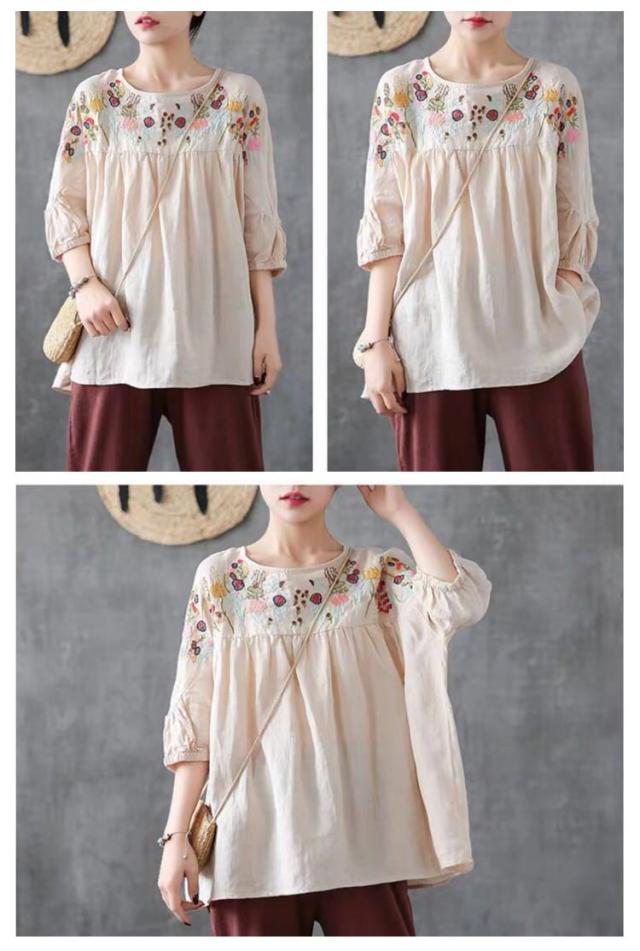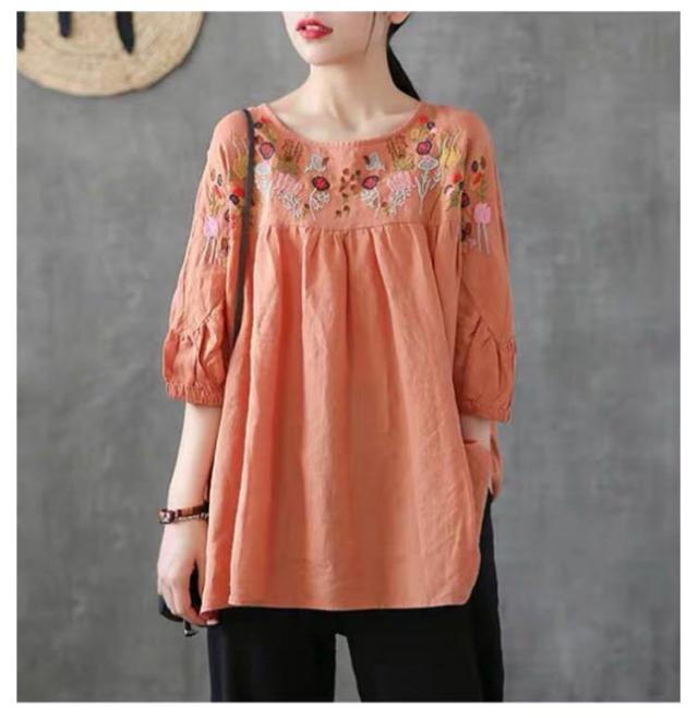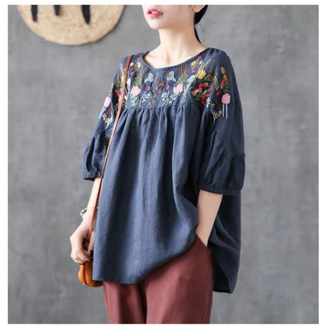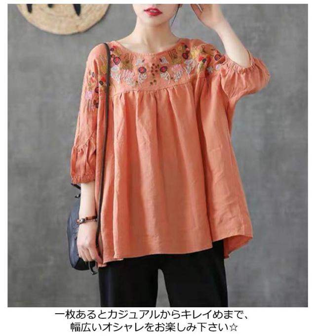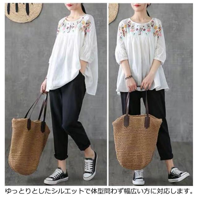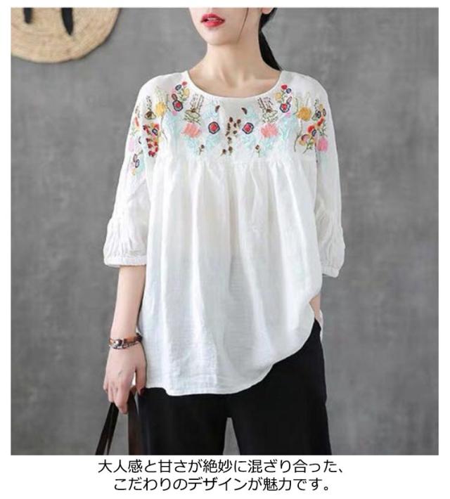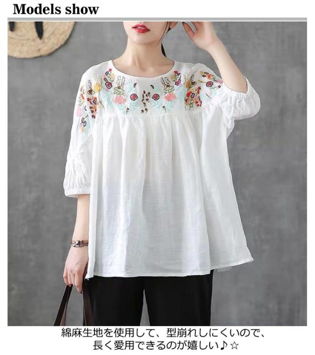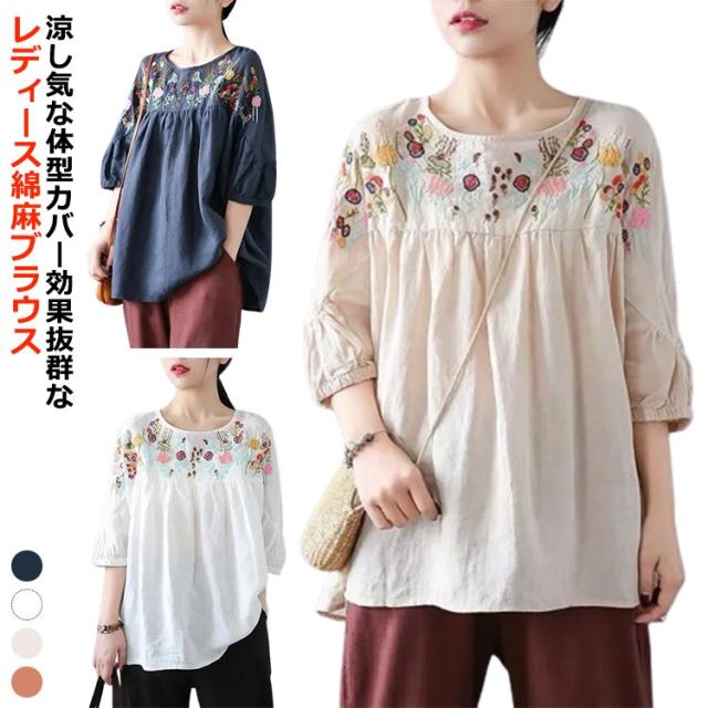 ナチュラル オフィス レディース クルーネック シャツ 綿 シャツブラウス 通勤 きれいめ 花柄 ブラウス 個性的 可愛い トップス 薄手 ゆったり 体型カバー 5分袖 春 夏 大きいサイズ 着痩せ フェミニン 50代 30代 40代 敬老の日 ギフト プレゼント
