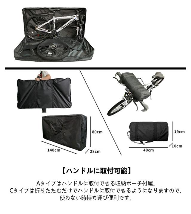 | 26~27インチ対応♪コンパクトに収納、手軽に持ち運ぶ輪行バッグ。 【収納簡単・フレームを傷つけにくい】ホイールポケット(仕切り)付きでわざわざホイールを縛る手間なく、自転車を横向きに収納することができます。ホイールと自転車フレームを別々に収納することができ、傷つけることを避けられます 【前輪外しタイプで楽チン】前輪を外す横型の輪行バッグで、26インチ〜27インチ〜700cの自転車(ロードバイク/クロスバイク/マウンテンバイク)に対応します。初心者でも簡単に収納できる輪行キャリングバッグ、自転車保管、移動、引っ越し等にオススメです。 【修理ツールも収納可能】外側にポケットがあり、自転車のアクセサリーや修理ツール等の収納用に活用できます。 【ハンドルに取付可能】Aタイプはハンドルに取付できる収納ポーチ付属、Cタイプは折りたたむだけでハンドルに取付できるようになりますので、使わない時持ち運び便利です。 【丈夫な素材】耐久性のある防水素材、高い引裂抵抗、耐摩耗性に優れ、長くお使いいただけます。 【自転車移動に便利】ロードバイクやクロスバイクの持ち運びに最適な、輪行バック。自転車を収納して、電車などの公共交通機関に乗車できる輪行袋です。 | |