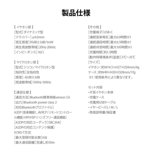 Bluetooth 5.0搭載 片耳ワイヤレスイヤホン 充電ケース付【イヤホン ワイヤレス 片耳 会議 テレワーク 在宅 オンライン ブルートゥース カナル型 ハンズフリー】