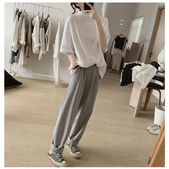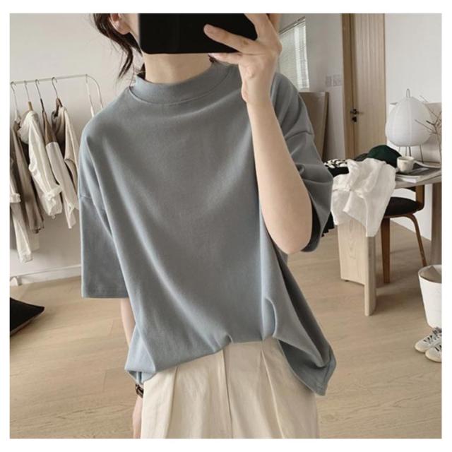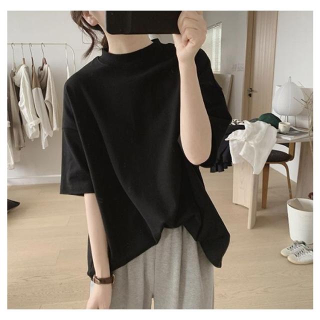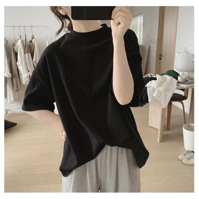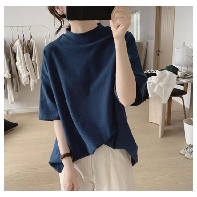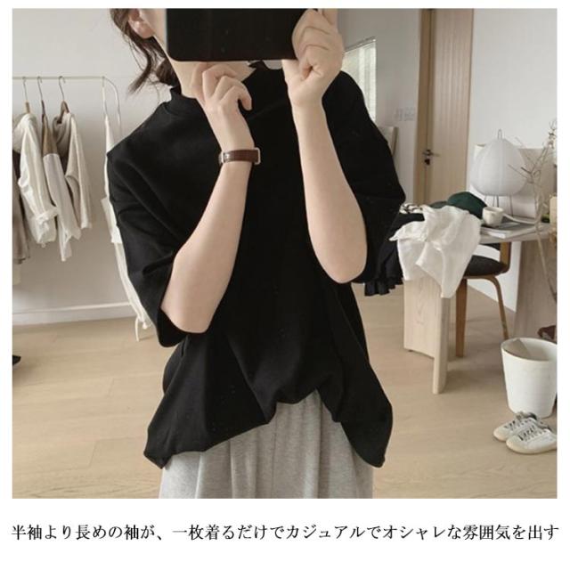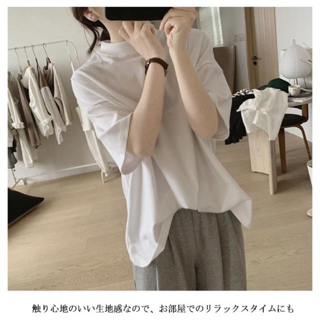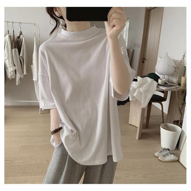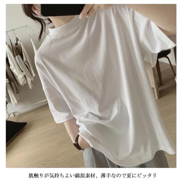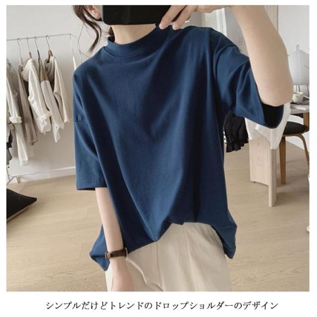 uvカット UV対策 プチハイネック 半袖 ドロップショルダー レディース 二の腕カバー ゆったり シンプル tシャツ 韓国ファッション トップス 綿 可愛い 無地 コットン 春夏 ボトルネック おしゃれ モックネック 5分袖 五分袖
