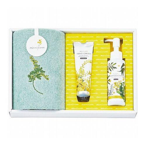 天然香料ミモザ精油がふんわりと柔らかく香る、するすると伸びる滑らかな使い心地のハンドクリームと、保湿成分ヒアルロン酸と、香料(ティーツリー・ユーカリ・ニアウリ・ラヴィンサラ・ミモザ)のアロマ精油を配合した、ほんのりとアロマの香り漂うハンドクリーンジェルと、春を告げる花ミモザをモチーフとした今治タオルのセットです。