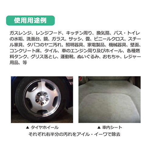 スレンジ、レンジフード、厨房機器、換気扇、浴室・浴槽、便器、洗面台、鏡、ガラス、サッシ、畳、ビニールクロス、スチール家具、タバコのヤニ汚れ、照明器具、家電製品、機械器具、外壁、コンクリート床、タイル、車のエンジン周り及びホイール、各種燃料タンク、グリス落とし、運動靴、ぬいぐるみ、おもちゃ、レジャー用品、等