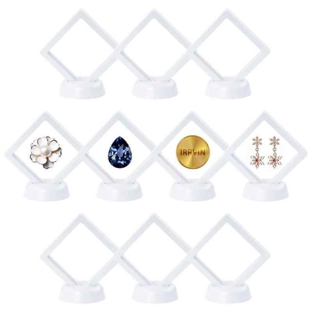 ルースケース アクセサリーケース ディスプレイケース コレクションケース 宝石 原石 フローティングフレーム 写真立て 透明フィルム バッジ収納 酸化防止 標本 アンティーク ピアス 指輪 台座付き (ホワイト, 7x7cm-10個セット)