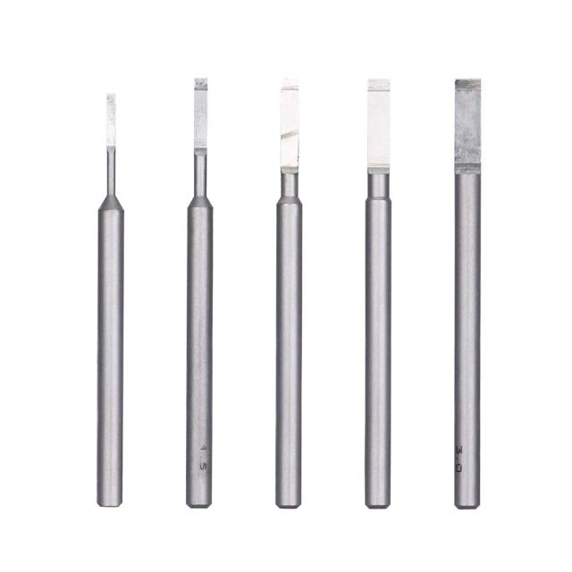 軸サイズ3mmに統一。刃を交換する際にピンバイス側でコレットを入れ替える必要がありません 刃部サイズ1mm、1.5mm、2mm、2.5mm、3mm 刃幅を使い分けることで造形クオリティや作業効率がアップします 消しゴム、木材、プラスチック、パテ材、レジンはもちろん、篆刻用の石も彫ることができます 保管や運搬に便利なケース付き