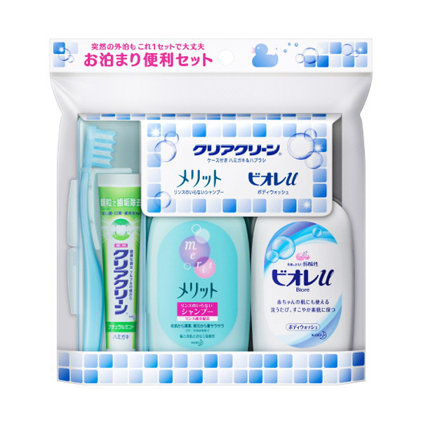 | セット内容 | クリアクリーン ケース付き ハミガキ&ハブラシ ・クリアクリーン 薬用ハミガキ ナチュラルミント 17g(医薬部外品) ・クリアクリーン 極太毛束 ハブラシ(ミニ) コンパクトヘッド(毛の硬さ:ふつう)1本 ビオレu ボディウォッシュ 90ml メリット リンスのいらないシャンプー 80ml(医薬部外品) |