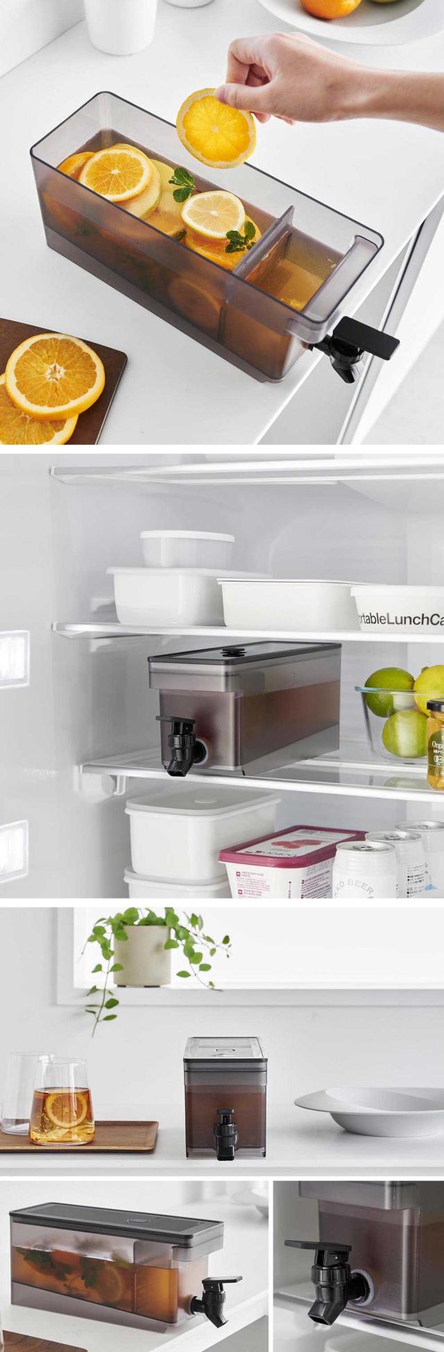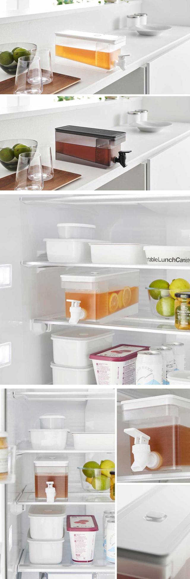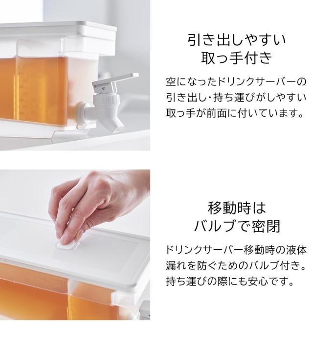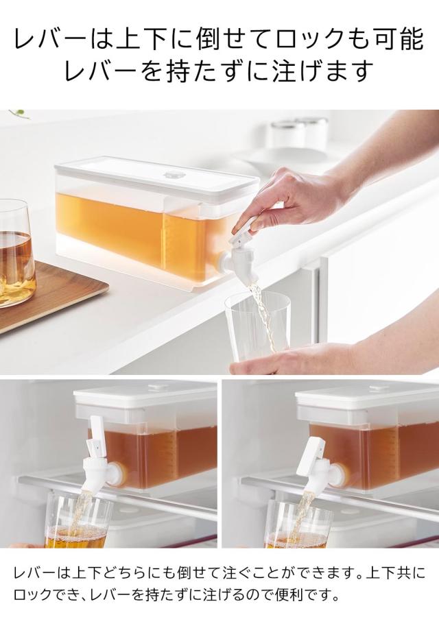 冷たいお茶が飲みたくなった時、冷蔵庫の中から冷水筒をわざわざ取り出さなくても、レバーを上下に倒せばすぐにその場でグラスに注げる、お手軽でコンパクトなドリンクサーバーです。冷蔵庫の奥行きを活かしたスリムで収まりの良いデザインで、1.8Lとしっかりと容量がありながら、庫内の高さがない棚にも収納できます。キッチンカウンターに設置すればパーティなどでも大活躍!お茶以外にも、フレーバーウォーターなどを作って楽しめます。中には仕切りが付いており、ティーパックやフレーバーウォーターの具材が注ぎ口を塞ぐことなく注げます。容器の底は傾斜しており、残量が少なくなっても安定して注げます。レバーは上下共にロックでき、レバーを持たずに注げるのも嬉しいポイントです。パーツは全て分解でき、細かい部分まで洗えるので衛生的です。