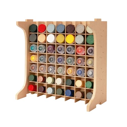 ・この塗料ラックは長さ30cm *高さ30cmです。全7段で各段7本、計49本収納可能のラックとなっております。各格子が36mm*38mmであるため、10ml TAMIYA/10ml MR HOBBY/18ml MR HOBBY/10ml gaia/18ml JUMPWIND塗料など、直径36 mm未満のボトルを収納できます。