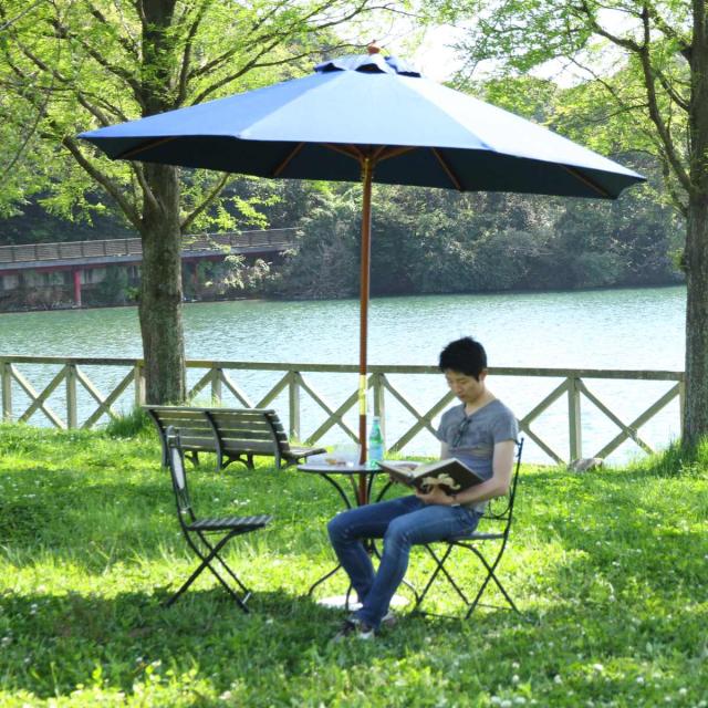 テーブルやベンチと合わせてお使いいただる木製のガーデンパラソル 270cmです。お庭で緑や花を見ながら一息つきたい時や、家族や友人たちとのバーベキューをする時などにも便利です。
