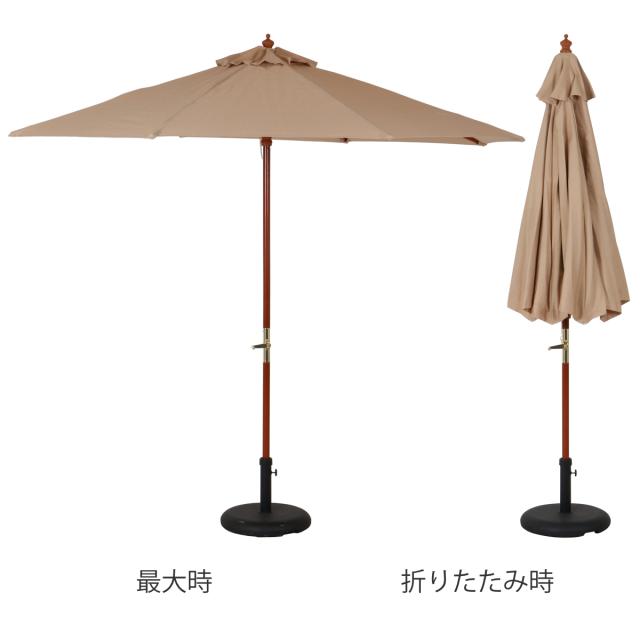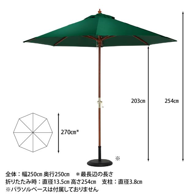 | サイズ | 約 幅250×奥行250×高さ254(cm) 親骨の長さ:142cm 展開時最長辺サイズ:約270cm 支柱径:直径3.8cm |