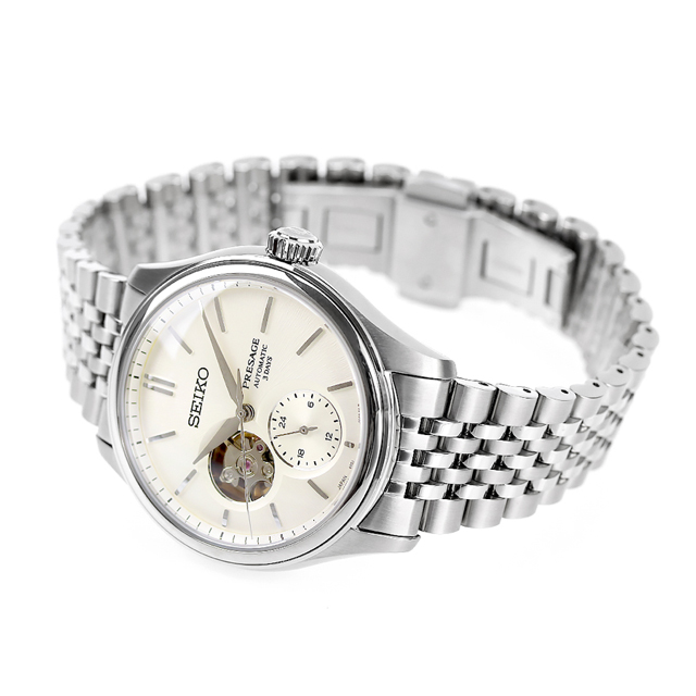 正規品 7年保証キャンペーン 送料無料 セイコー プレザージュ コアショップ専用 流通限定 日本製 メンズ 腕時計 SARJ007 SEIKO PRESAGE Classic Series アナログ オフホワイト 白 ◆古くから日本人の暮らしを彩ってきた、機能性と美しさを併せ持った数々の工芸品に込められた感性を表現。オーセンティックな造形をベースとしながら、日本の伝統文化に根差した要素をエッセンスとして取り入れ。使い込むごとに身体や生活に馴染んでいくような飽きの来ないデザインとなっております。立体的なダイヤルが、クラシックな雰囲気を演出。日本の伝統的素材である絹に着目し、生糸の質感をイメージした模様を採用。立体成型ダイヤルの曲面に型打ち模様を組み合わせることで、独自の深い味わいを実現しております。針やインデックスをダイヤルの曲面に合わせてカーブさせることで、ダイヤル全体が柔らかな光で輝いて見えます。ケースは柔らかな曲面で構成された、思わず指先で触れたくなるような親しみやすさを感じられる造形に。 発売日:2024年6月発売 機械式腕時計