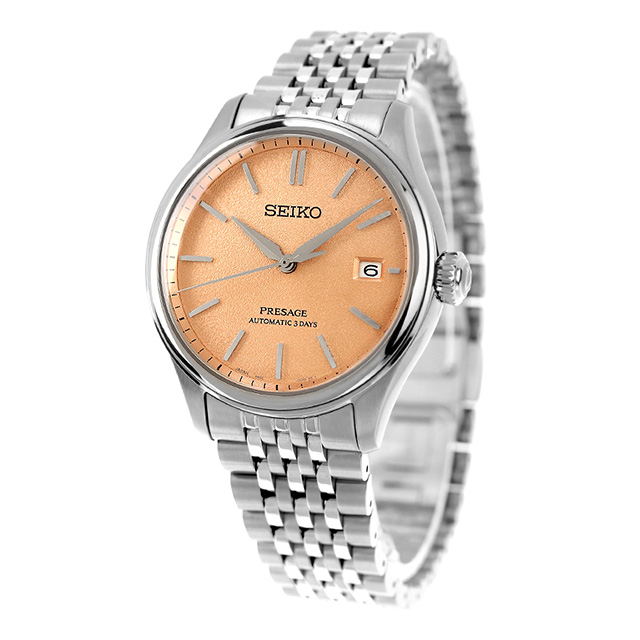 正規品 7年保証キャンペーン 送料無料 セイコー プレザージュ コアショップ専用 流通限定 日本製 メンズ 腕時計 SARX125 SEIKO PRESAGE Classic Series アナログ 洗柿(だいだい) ◆古くから日本人の暮らしを彩ってきた、機能性と美しさを併せ持った数々の工芸品に込められた感性を表現。オーセンティックな造形をベースとしながら、日本の伝統文化に根差した要素をエッセンスとして取り入れ。使い込むごとに身体や生活に馴染んでいくような飽きの来ないデザインとなっております。立体的なダイヤルが、クラシックな雰囲気を演出。日本の伝統的素材である絹に着目し、絹織物の生地をイメージした模様を採用。立体成型ダイヤルの曲面に型打ち模様を組み合わせることで、独自の深い味わいを実現しております。針やインデックスをダイヤルの曲面に合わせてカーブさせることで、ダイヤル全体が柔らかな光で輝いて見えます。ケースは柔らかな曲面で構成された、思わず指先で触れたくなるような親しみやすさを感じられる造形に。 発売日:2024年6月発売 機械式腕時計