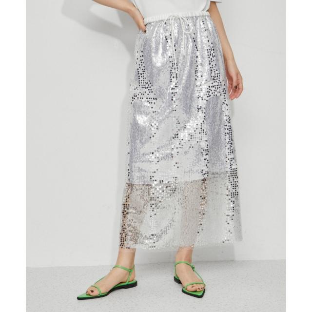 【トレンド感のあるコーディネートに格上げ。シンプルなトップスとの合わせでも存在感のある着こなしが叶う、スパンコールスカート】