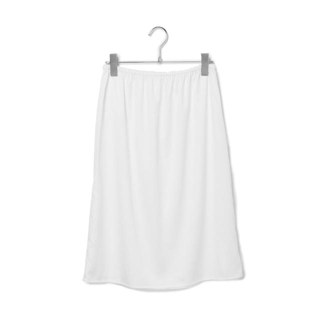 ウエスト部分、後ろの裾スリット部分には別布を使用してメリハリをプラス。膝丈のインナーペチスカート付のため、一枚での着用と、パンツなどに重ねて透けを楽しめるスタイリングも可能な一着。