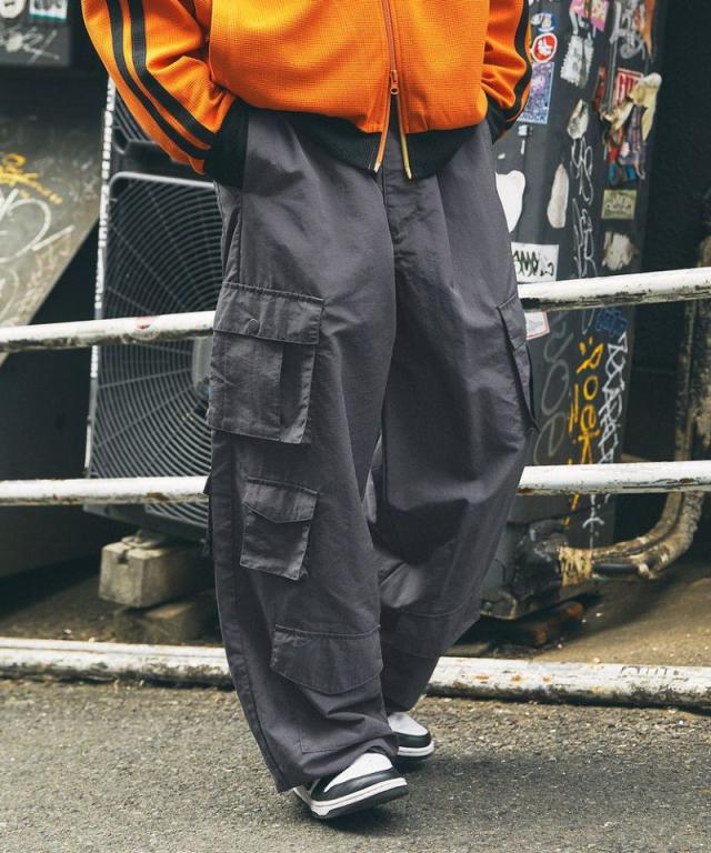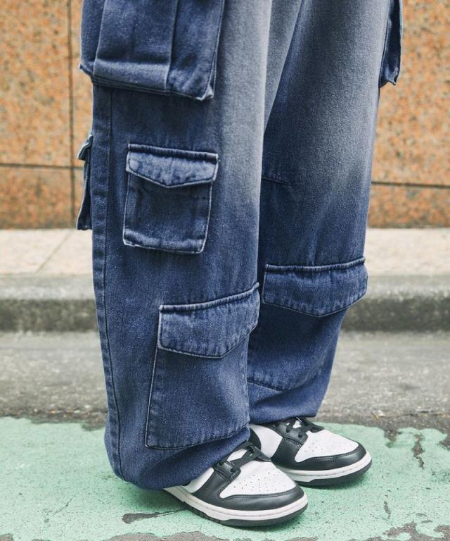 ポケットがアトランダムに付けられた、バギーシルエットのナイロン/デニムカーゴパンツ。