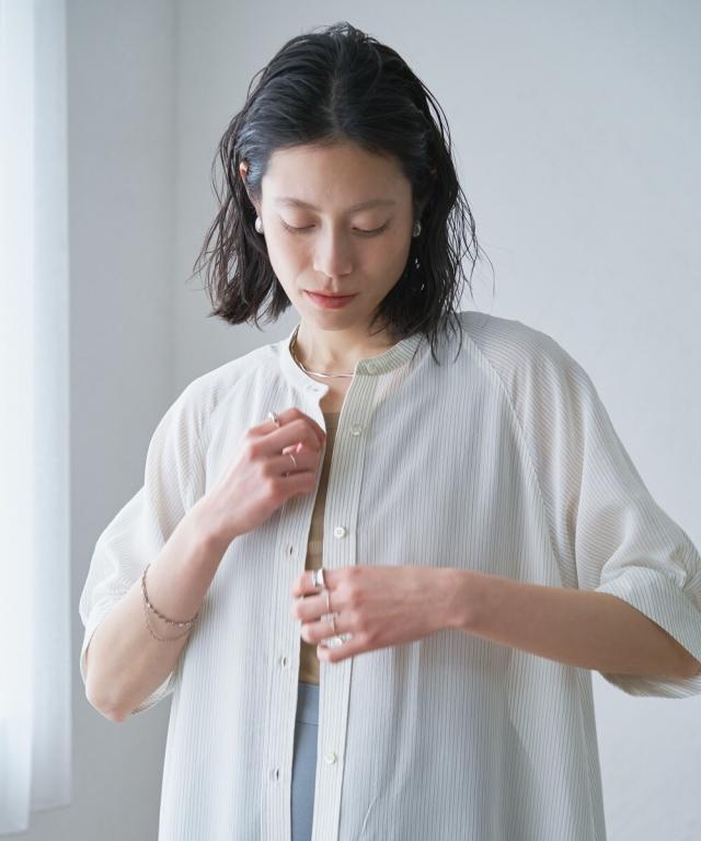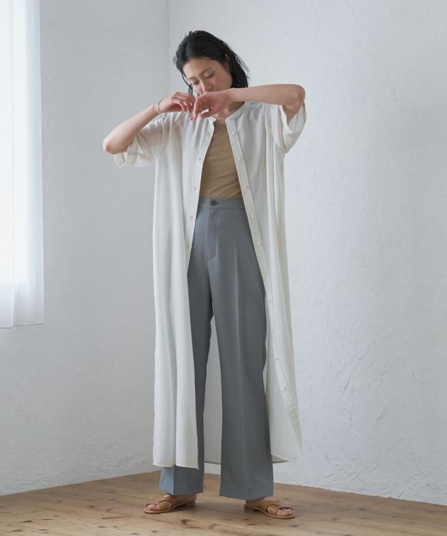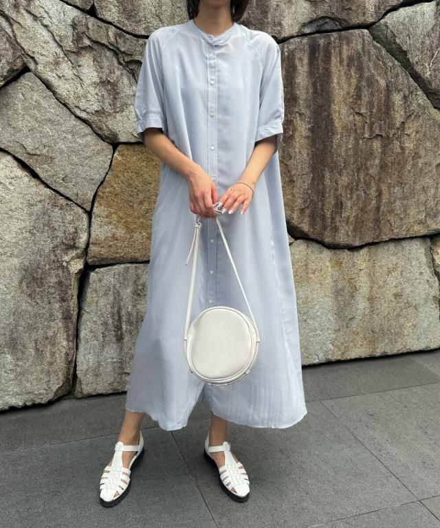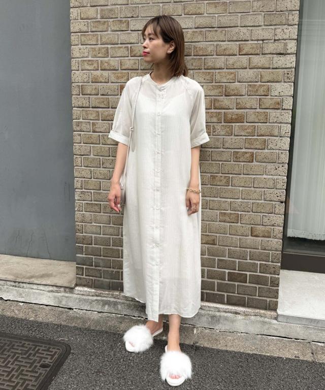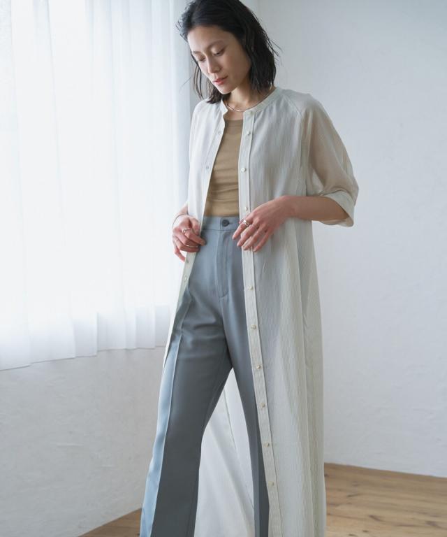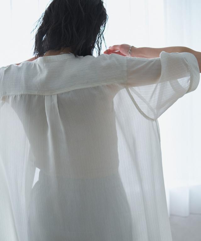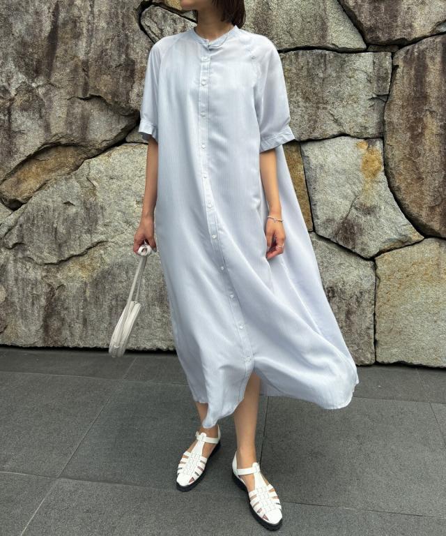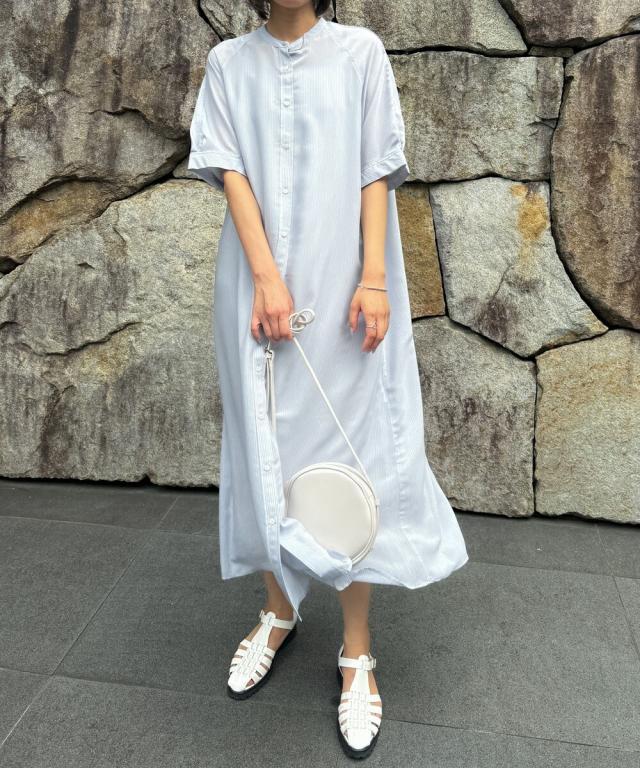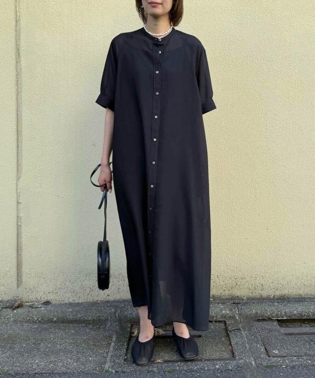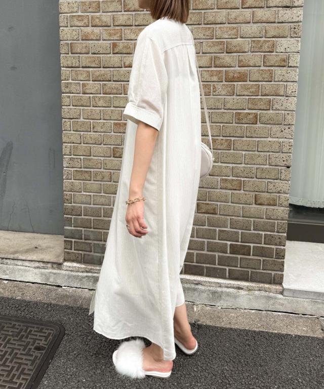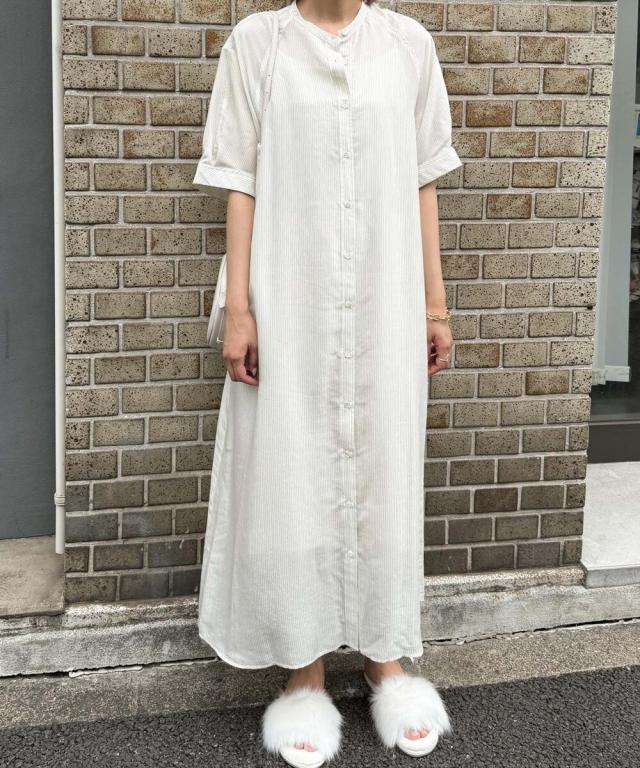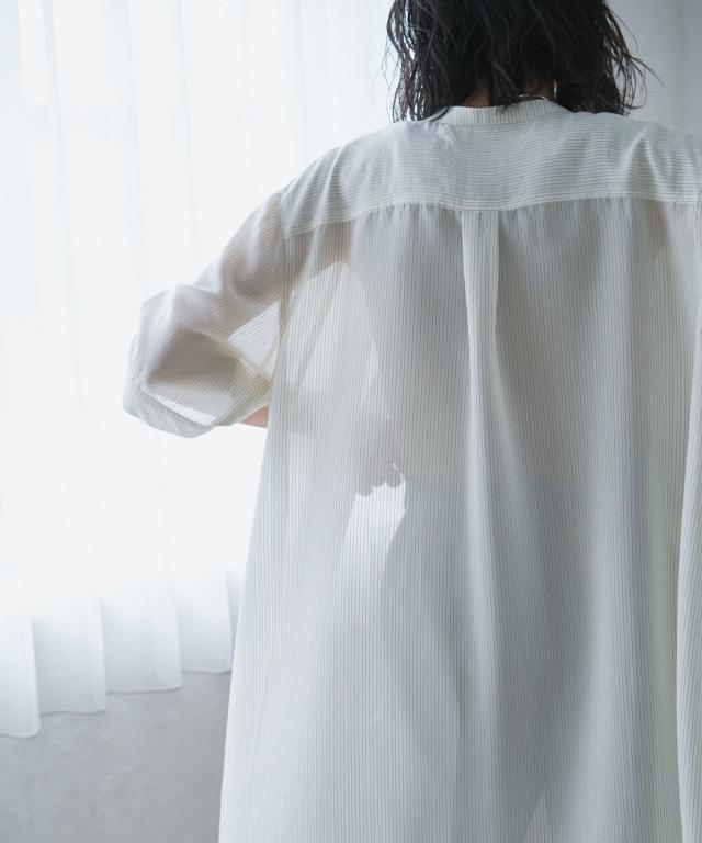 【半袖/インナー付/ロング丈/前開き】シアーストライプバンドカラーシャツワンピース