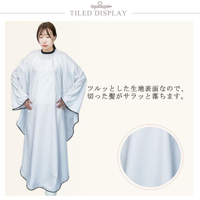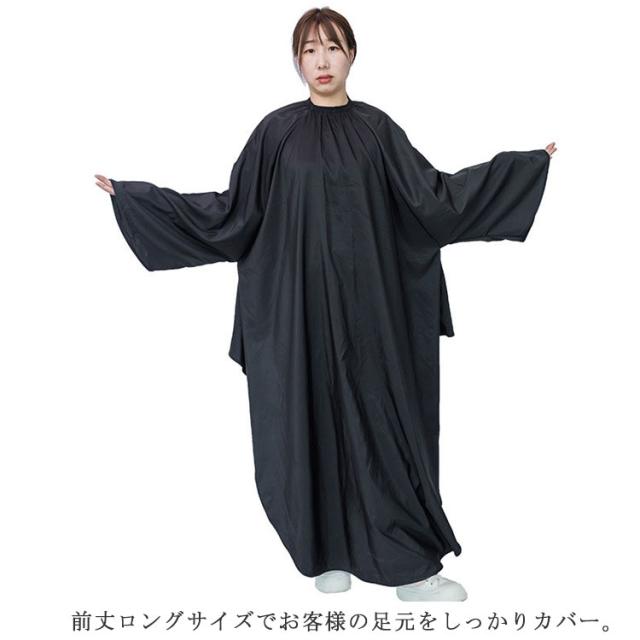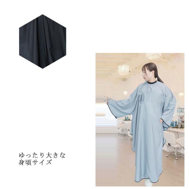 | ・袖付カットクロス ・ツルッとした生地表面なので、切った髪がサラッと落ちます。 ・ゆったり大きな身頃サイズ ・前丈ロングサイズでお客様の足元をしっかりカバー。 | |