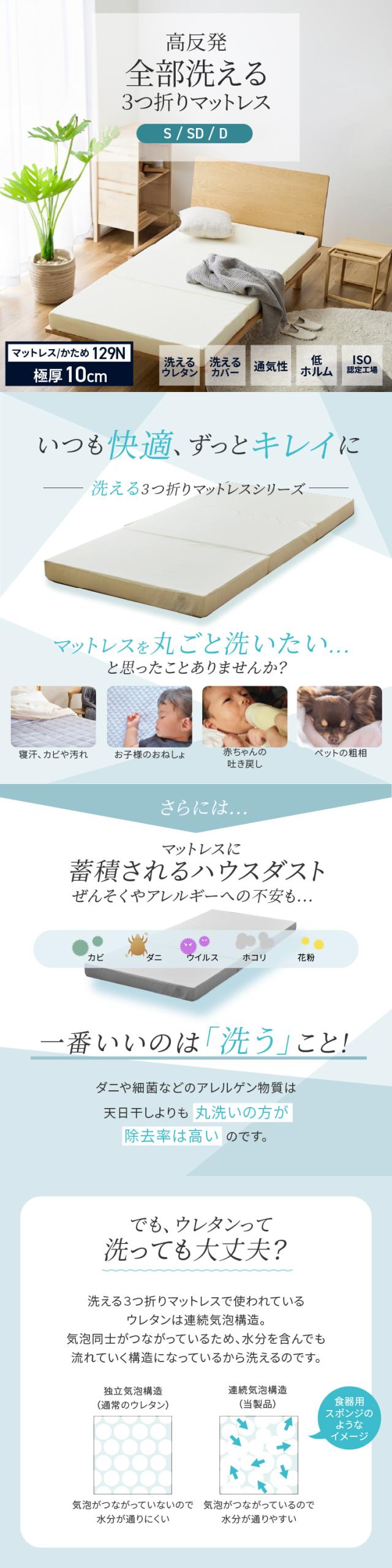 ※品質表示タグが手洗い表記の商品が届く場合がございますが、洗濯機・脱水機をご使用いただいても問題ありません。 洗えるウレタンを使用した3つ折りマットレス。