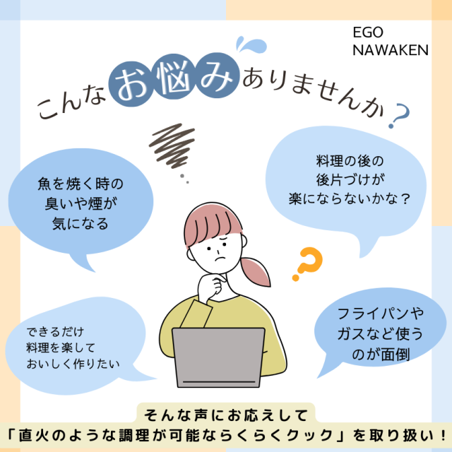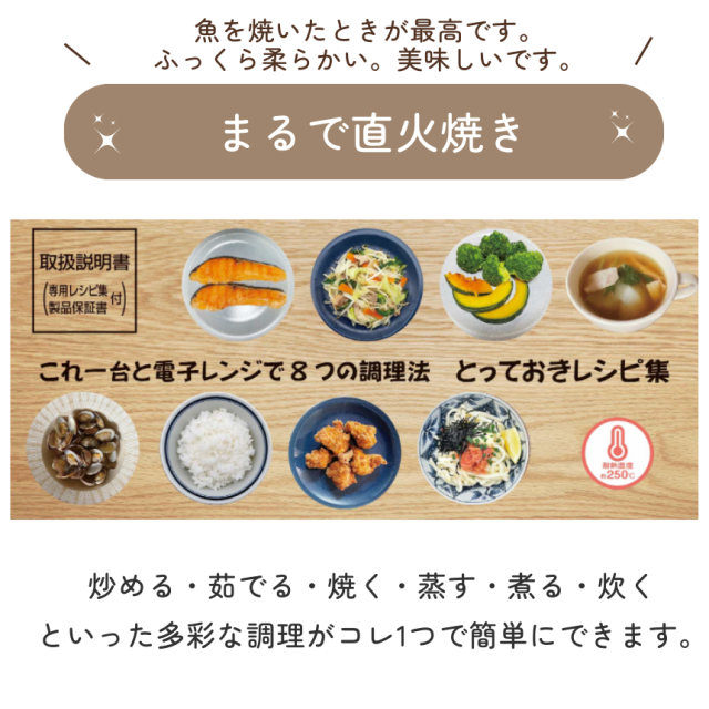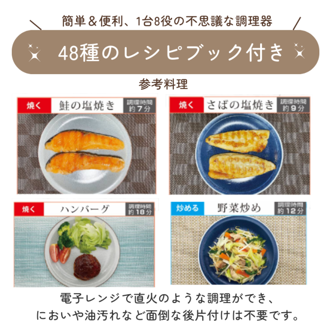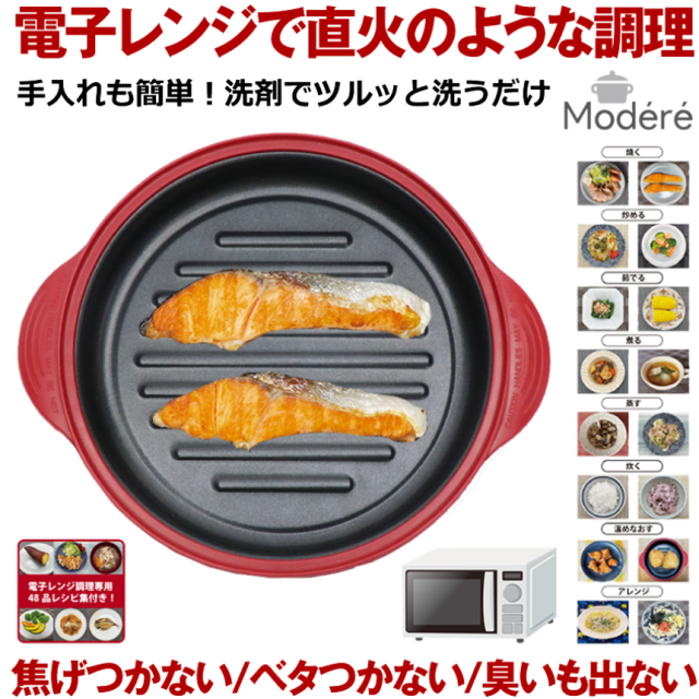 電子レンジで直火のような調理ができ、においや油汚れなど面倒な後片付けは不要です。