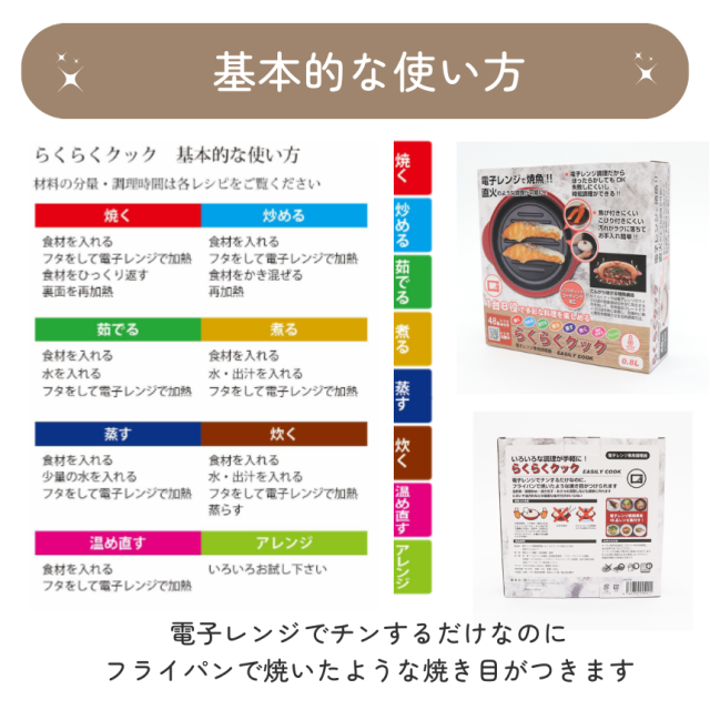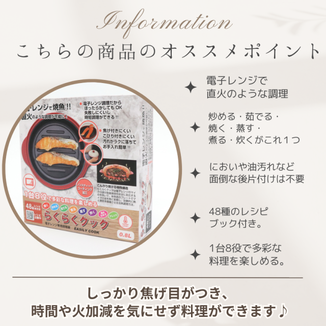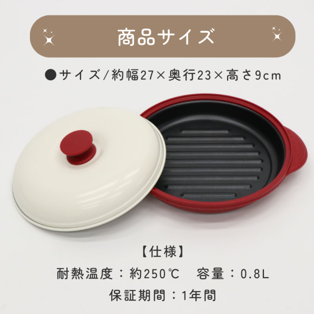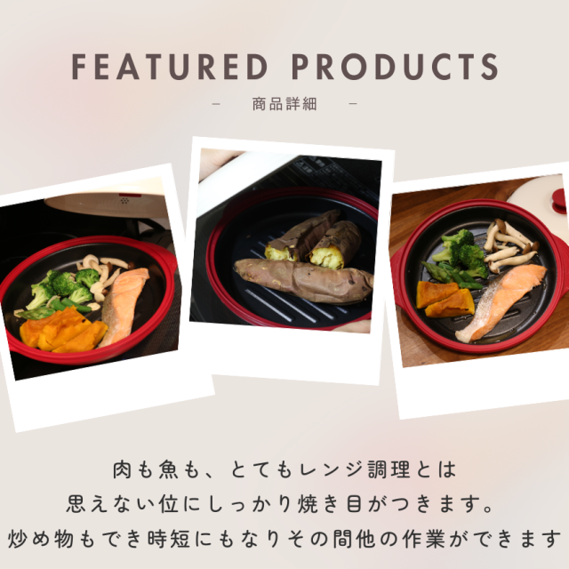 《注意事項》 ※基本的な電子レンジサイズで対応可能です。 ※お使いの電子レンジの取扱説明書を参照の上、電子レンジ庫内の手入れを行ってからご使用ください。 ※電子レンジ専用のため直火、電磁調理器(IH調理器)では使用しないでください。 ※必ず電子レンジ機能でご使用ください。オーブン機能、スチーム機能、オート調理機能でのご使用不可。