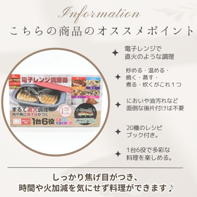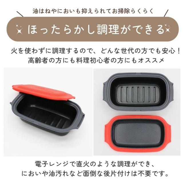 - 便利ですね、今まではフライパンで魚を焼いていました。 電子レンジ調理器を使うと、焼き目がつくのに、焦げないのが良いです。