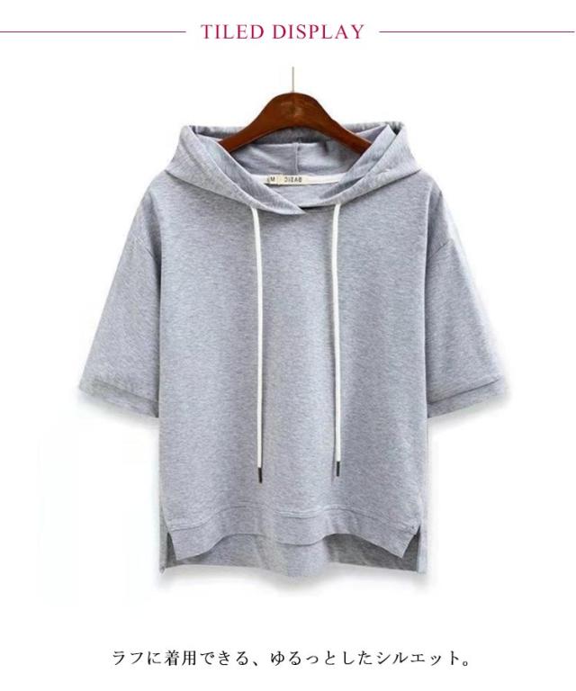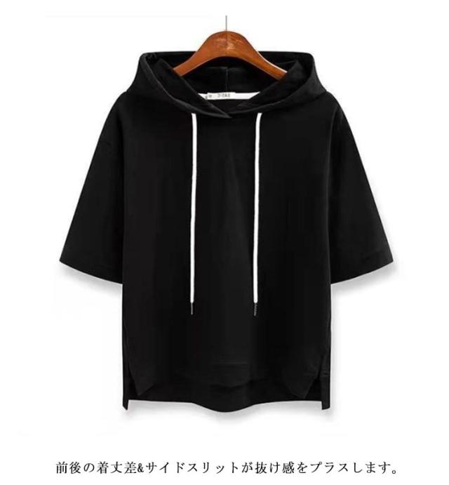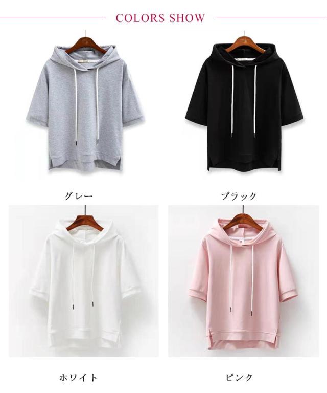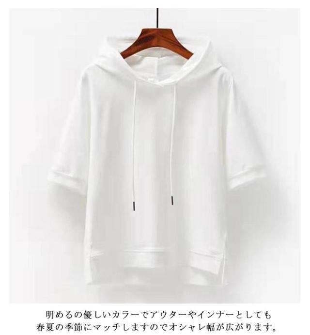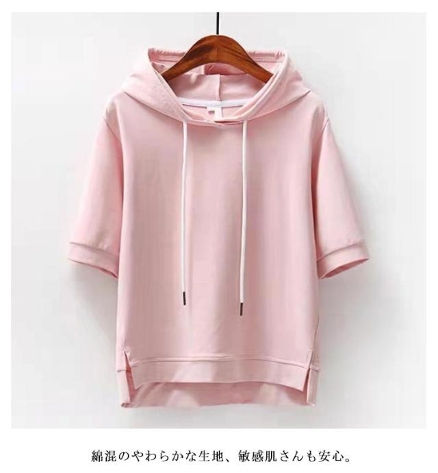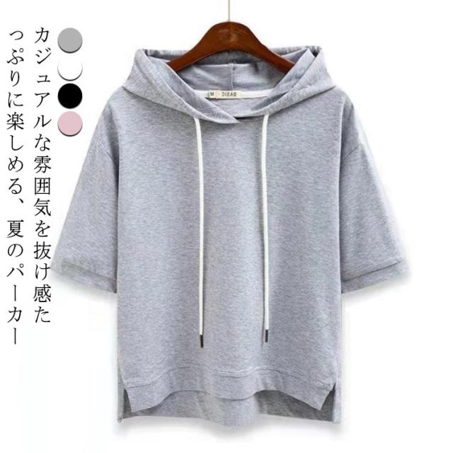 パーカー Tシャツ フード付き レディース 半袖 カットソー 夏 綿 コットン カジュアル トップス トレーナー プルオーバー スリット 半袖パーカー 無地 シンプル ゆったり 大きいサイズ スポーティ 着回し 黒 白 グレー ブラック ホワイト ピンク おしゃれ