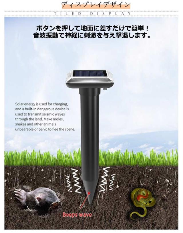 | ネズミ・蛇・モグラなどを追い払う!ソーラー式撃退棒。 ボタンを押して地面に差すだけで簡単!音波振動で神経に刺激を与え撃退します。 ソーラー充電なので太陽光が当たる場所に設置しておけば自動充電&保存電力してくれます。 防水機能が付いているので、雨などの悪い天気にもお使いいただけます。 ご自宅のお庭や公園などに複数使いで荒らしに悩まさせられることのない生活を。 | |