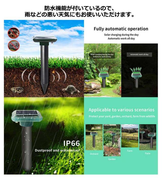 動物撃退器 超音波 猫よけ対策 モグラ ネズミ 蛇 害獣撃退器 ソーラー充電 長時間使用 撃退棒 モグラ 蛇 ネズミ 超音波 太陽光 ソーラー式 防水 芝生 庭園 畑用 家庭菜園 畑/庭保護 糞被害対策 鳥害対策 ネズミ駆除 ヘビよけ