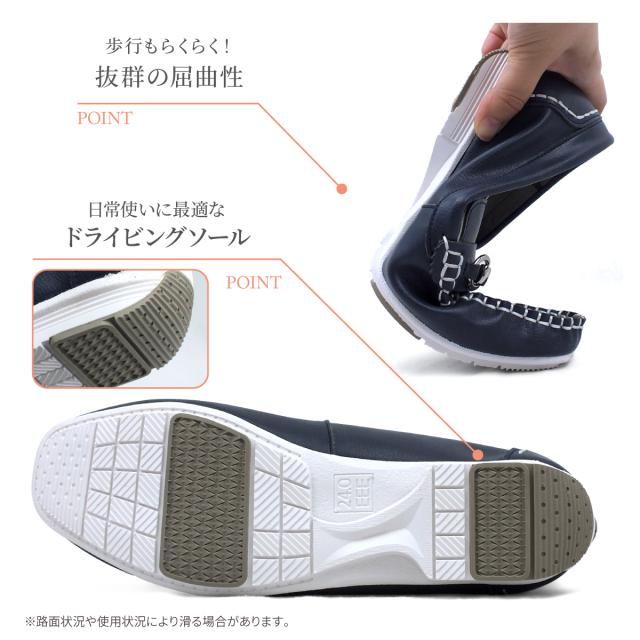 シンプルなデザインでトレンドに左右されず、いろいろなコーデにフィットするモカシンシューズ。柔らかくしっとりとした質感のソフトPUレザーを使用。中敷きにはふかふかのクッションインソールを採用し快適な履き心地を実現。柔らかな素材に屈曲性抜群のアウトソールで歩行がとても滑らか。足の負担を少しでも軽減し、快適な履き心地を追求した1足です。3Eの幅広設計でゆったりとした履き心地をお届けします。